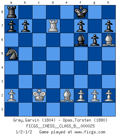 Last move : 1/2-1/2 2007 November 16 2:53:50 [Event "FICGS__CHESS__CLASS_B__000025"] [Site "FICGS"] [Date "2007.07.13"] [Round "1"] [White "Gray,Garvin"] [Black "Opas,Torsten"] [Result "1/2-1/2"] [WhiteElo "1804"] [BlackElo "1880"] 1.d4 Nf6 2.c4 g6 3.Nc3 d5 4.cxd5 Nxd5 5.e4 Nxc3 6.bxc3 Bg7 7.Bc4 c5 8.Ne2 Nc6 9.Be3 O-O 10.Rc1 cxd4 11.cxd4 Qa5+ 12.Qd2 Qxd2+ 13.Kxd2 Rd8 14.d5 e6 15.Nf4 Na5 16.Be2 exd5 17.Nxd5 Be6 18.Rhd1 Bxd5 19.exd5 Bb2 20.Rb1 Rxd5+ 21.Kc2 Rxd1 22.Rxd1 Bf6 23.Rd7 Kf8 24.Bh6+ 1/2-1/2 King's Indian defense, 3.Nc3 Kingside Castling by player Black (move 9) This chess game ended in a draw. Follow this game move after move (download)Mistrust is the most necessary characteristic of the Chess player. (Siegbert Tarrasch) Ich kenne keine einzige Person, die behaupten würde, Garri Kasparow sei ein guter Mensch (Nigel Short) La captura del Rey enemigo es la finalidad pero no el primer objetivo de la partida. (William Steinitz) Le jeu d'échecs est comme rejeté hors du temps. (Antoine de Saint-Exupéry) The right perception of any matter and a misunderstanding of the same matter do not wholly exclude each other. (Kafka's the trial)