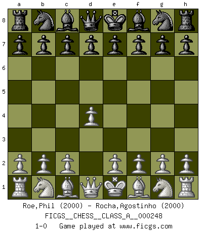 Last move : 1-0 2021 August 3 1:50:58 [Event "FICGS__CHESS__CLASS_A__000248"] [Site "FICGS"] [Date "2021.06.23"] [Round "1"] [White "Roe,Phil"] [Black "Rocha,Agostinho"] [Result "1-0"] [WhiteElo "2000"] [BlackElo "2000"] 1.d4 1-0 This chess game has been lost on time (started : 2021.06.23 13:12:31) Queen's pawn Player White won this chess game. Follow this game move after move (download)Chess is a matter of delicate judgment, knowing when to punch and how to duck. (Bobby Fischer) Ich verlor meine Bürgerrechte, mein Gehalt wurde mir nicht mehr bezahlt und ich wurde zensiert und durfte nicht mehr ins Ausland reisen. [nach dem Match Fischer-Taimanov 6:0] (Mark Taimanov) Yo considero que Fischer es uno de los expertos mas grandes de aperturas de siempre. (Keith Hayward) Je menace de comprendre la position. (Anonyme) Do you know these so called Volunteers don't even get paid! (Simpsons)