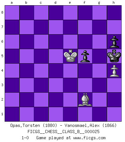 Last move : 1-0 2008 January 2 11:36:24 [Event "FICGS__CHESS__CLASS_B__000025"] [Site "FICGS"] [Date "2007.07.13"] [Round "1"] [White "Opas,Torsten"] [Black "Vanosmael,Alex"] [Result "1-0"] [WhiteElo "1880"] [BlackElo "1866"] 1.e4 c6 2.Nf3 d5 3.Nc3 Bg4 4.h3 Bxf3 5.Qxf3 e6 6.d4 dxe4 7.Qxe4 Nf6 8.Qh4 Qb6 9.Bd3 Na6 10.a3 Rd8 11.Ne2 c5 12.O-O cxd4 13.b4 Be7 14.Bb2 Ng8 15.Qg3 Bf6 16.Rad1 g6 17.Ba1 Ne7 18.c4 O-O 19.c5 Nxc5 20.bxc5 Qxc5 21.Qf3 Kg7 22.Qxb7 Qxa3 23.Qe4 Qc5 24.Rc1 Qd5 25.Rfd1 e5 26.f4 exf4 27.Nxf4 Qxe4 28.Bxe4 Rd6 29.g4 Rfd8 30.Rc7 a6 31.Kg2 h6 32.Rb1 R6d7 33.Rxd7 Rxd7 34.Rb6 a5 35.Ra6 Bh4 36.Rxa5 Be1 37.Ra7 Rxa7 38.Bxd4+ Kh7 39.Bxa7 Bb4 40.Bd4 f5 41.gxf5 Nxf5 42.Bxf5 gxf5 43.h4 Bd6 44.Kf3 Bxf4 45.Kxf4 Kg6 46.Bf2 Kh5 47.Ke5 1-0 Caro-Kann defense Kingside Castling by player White (move 12) Kingside Castling by player Black (move 18) 10 pieces endgame at move 41 : White KBBNP , Black KBNPP WHITE : King + 2 Bishops 1 Knight 1 Pawn BLACK : King + 1 Bishop 1 Knight 2 Pawns 9 pieces endgame at move 42 : White KBBNP , Black KBPP WHITE : King + 2 Bishops 1 Knight 1 Pawn BLACK : King + 1 Bishop 2 Pawns 8 pieces endgame at move 42 : White KBNP , Black KBPP WHITE : King + 1 Bishop 1 Knight 1 Pawn BLACK : King + 1 Bishop 2 Pawns 7 pieces endgame at move 44 : White KBP , Black KBPP WHITE : King + 1 Bishop 1 Pawn BLACK : King + 1 Bishop 2 Pawns 6 pieces endgame at move 45 : White KBP , Black KPP WHITE : King + 1 Bishop 1 Pawn BLACK : King + 2 Pawns Player White won this chess game. Follow this game move after move (download)Bobby is the finest Chess player this country ever produced. His memory for the moves, his brilliance in dreaming up combinations, and his fierce determination to win are uncanny. (John Collins) Schach wird sich dank seiner hohen kulturellen Tradition immer durchsetzen. In näherer Zukunft womöglich sogar als Gegenreaktion auf die maßlose Reizüberflutung im Freizeit- und Spielbereich. (Garry Kasparov) Tu puedes aprender mucho mas de una partida que pierdas que de una partida ganada. Tendras que perder cientos de partidas antes de llegar a ser un buen jugador. (Jose Raul Capablanca) On peut tirer plus d'utilité d'une partie perdue que de 100 parties gagnées. (Capablanca) I have opinions of my own - strong opinions - but I don't always agree with them. (George Bush)