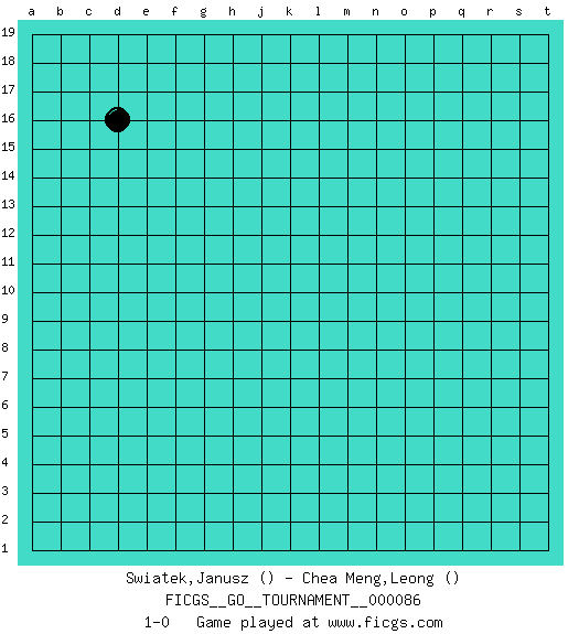 Last move : 1-0 2021 July 27 19:21:2 [Event "FICGS__GO__TOURNAMENT__000086"] [Site "FICGS"] [Date "2021.06.26"] [Round "1"] [Black "Swiatek,Janusz"] [White "Chea Meng,Leong"] [Result "1-0"] 1.d16 1-0 This go game has been lost on time (started : 2021.06.26 23:26:31) Here are the names of the openings (joseki) played in the four corners : Player Black won this Go (weiqi, baduk) game. Follow this game move after move (download)Don't defend - extend ! (Bill Taylor) Patience, use the Force, think ! (Obi-Wan Kenobi in Star Wars ep.2)