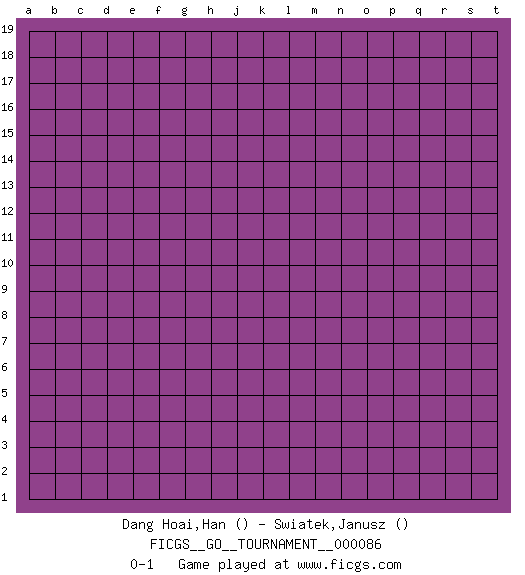 Last move : 0-1 2021 July 27 4:30:9 [Event "FICGS__GO__TOURNAMENT__000086"] [Site "FICGS"] [Date "2021.06.26"] [Round "1"] [Black "Dang Hoai,Han"] [White "Swiatek,Janusz"] [Result "0-1"] 0-1 This go game has been lost on time (started : 2021.06.26 23:26:31) Here are the names of the openings (joseki) played in the four corners : Player White won this Go (weiqi, baduk) game. Follow this game move after move (download)Territory is a closed space where time no longer exists. The transformation around it slower alter it, and sometimes it cracks open like a rotten egg at the least shock. (Pierre Audouard) The best weapon against an enemy is another enemy. (Friedrich Nietzsche)