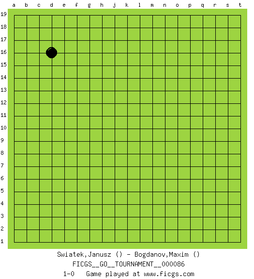 Last move : 1-0 2021 July 27 19:21:2 [Event "FICGS__GO__TOURNAMENT__000086"] [Site "FICGS"] [Date "2021.06.26"] [Round "1"] [Black "Swiatek,Janusz"] [White "Bogdanov,Maxim"] [Result "1-0"] 1.d16 1-0 This go game has been lost on time (started : 2021.06.26 23:26:31) Here are the names of the openings (joseki) played in the four corners : Player Black won this Go (weiqi, baduk) game. Follow this game move after move (download)Go is to western chess what philosophy is to double entry accounting. (from Shibumi, by Trevanian) All maxims have their antagonist maxims; proverbs should be sold in pairs, a single one being but a half truth. (William Mathews)