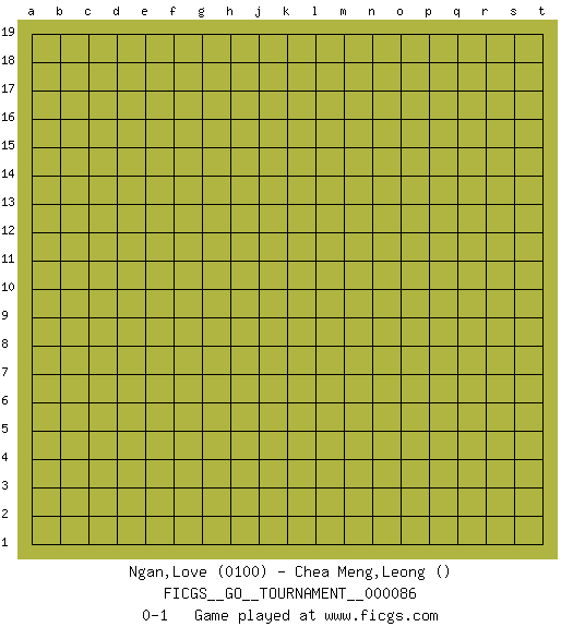 Last move : 0-1 2021 July 27 4:30:9 [Event "FICGS__GO__TOURNAMENT__000086"] [Site "FICGS"] [Date "2021.06.26"] [Round "1"] [Black "Ngan,Love"] [White "Chea Meng,Leong"] [Result "0-1"] [Rating 1 "0100"] 0-1 This go game has been lost on time (started : 2021.06.26 23:26:31) Here are the names of the openings (joseki) played in the four corners : Player White won this Go (weiqi, baduk) game. Follow this game move after move (download)Beginner's games are surprising, often incoherent and incomprehensible. When you improve, your game gains in consistency but flirts with stupidity: you become satisfied with truisms and mechanical movements, you try to obtain a feeling for clearness and style the easy way. (Pierre Audouard) Perception is reality. (Immanuel Kant)