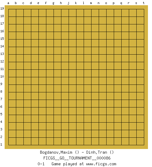 Last move : 0-1 2021 July 27 4:30:9 [Event "FICGS__GO__TOURNAMENT__000086"] [Site "FICGS"] [Date "2021.06.26"] [Round "1"] [Black "Bogdanov,Maxim"] [White "Dinh,Tran"] [Result "0-1"] 0-1 This go game has been lost on time (started : 2021.06.26 23:26:31) Here are the names of the openings (joseki) played in the four corners : Player White won this Go (weiqi, baduk) game. Follow this game move after move (download)The poor player plays the opponent's game for him. (Anonymous) The ultimate in disposing one's troops is to be without ascertainable shape. Then the most penetrating spies cannot pry in nor can the wise lay plans against you. (Sun Tzu)
