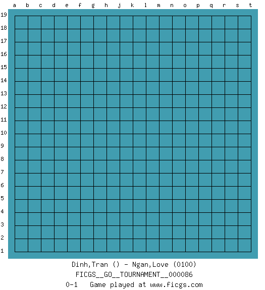 Last move : 0-1 2021 July 27 4:30:9 [Event "FICGS__GO__TOURNAMENT__000086"] [Site "FICGS"] [Date "2021.06.26"] [Round "1"] [Black "Dinh,Tran"] [White "Ngan,Love"] [Result "0-1"] [Rating 2 "0100"] 0-1 This go game has been lost on time (started : 2021.06.26 23:26:31) Here are the names of the openings (joseki) played in the four corners : Player White won this Go (weiqi, baduk) game. Follow this game move after move (download)Atari, atari is vulgar play. (Anonymous) Watch your thoughts; they become words. Watch your words; they become actions. Watch your actions; they become habits. Watch your habits; they become character. Watch your character; it becomes your destiny. (Frank Outlaw)