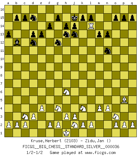 Last move : 1/2-1/2 2021 November 4 14:40:26 [Event "FICGS__BIG_CHESS__STANDARD_SILVER__000036"] [Site "FICGS"] [Date "2021.07.01"] [Round "1"] [White "Kruse,Herbert"] [Black "Zidu,Jan"] [Result "1/2-1/2"] [WhiteElo "2103"] [BlackElo ""] 1.j2-k4 p16-o14 2.h1-o7 j15-h13 3.e2-e4 k16-l14 4.f1-a6 g16-f14 5.m2-m4 b16-c14 6.n2-n4 e15-e13 7.o1-e10 h16-l13 8.m1-m3 d15-d13 9.m3-l3 l13-g9 10.p1-o3 c16-g12 11.j1-h1 g12-e10 12.a6-e10 g9-f10 13.o7-b7 f16-b12 14.h2-g4 m15-m13 15.d2-d3 n15-n13 16.e1-e3 l16-p12 17.k1-h2 o16-f8 18.g1-j2 e16-e14 19.e3-f3 c14-d12 20.e10-h7 f10-h10 21.l3-l10 h10-h9 22.h7-m3 m16-m14 23.l10-l9 h9-k7 24.f3-f7 k7-k12 25.l9-b9 e14-b14 26.l1-o4 a16-e16 27.c1-k8 f14-d15 28.b7-a8 a15-a13 29.b9-f9 b14-f14 30.f9-f14 h13-f14 31.b1-c3 e16-e14 32.a1-e1 f14-g12 33.e1-e3 e14-f14 34.e3-f3 j16-j15 35.a8-c6 f8-c11 36.f7-f14 h15-f14 37.c6-p6 q16-f16 38.m3-j6 l14-j13 39.j6-p12 k12-p12 40.p6-p12 o14-p12 41.h2-j4 f14-h13 42.f3-f5 f15-f14 43.k8-h6 c11-h6 44.j4-h6 f16-n16 45.f5-p5 m14-p14 46.q1-m1 n16-n14 47.m1-m3 p12-n11 48.m3-l3 p14-p5 49.o4-p5 n14-l14 50.l3-l14 1/2-1/2 Follow this game move after move (download)I have never in my life played the French Defence, which is the dullest of all openings. (Wilhelm Steinitz) Kann Schach nicht schließlich das Nationalspiel der Deutschen werden? Und welche weiteren Ausblicke bieten sich dann dar! Welche Hebung des allgemeinen Kultur-Niveaus, ja der Moral, wenn das Schachbrett den Kartentisch verdrängen würde! Wahrlich, ein Ziel, des Schweißes der Edlen wert! (Siegbert Tarrasch) Antes de los Finales, los dioses han colocado el Juego Medio. (Siegbert Tarrasch) Les échecs, c'est l'imagination. (David Bronstein) Home computers are being called upon to perform many new functions, including the consumption of homework formerly eaten by the dog. (Doug Larson)