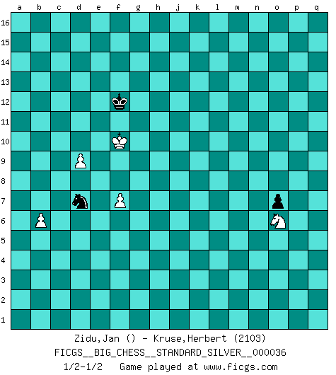 Last move : 1/2-1/2 2023 May 31 20:49:24 [Event "FICGS__BIG_CHESS__STANDARD_SILVER__000036"] [Site "FICGS"] [Date "2021.07.01"] [Round "2"] [White "Zidu,Jan"] [Black "Kruse,Herbert"] [Result "1/2-1/2"] [WhiteElo ""] [BlackElo "2103"] 1.b2-b3 j15-k13 2.p1-o3 h16-o10 3.j2-h4 e15-e13 4.k1-l3 f16-a11 5.g1-f3 m15-m13 6.b1-c3 n15-n13 7.c1-b2 o16-e7 8.c3-d5 e7-m14 9.e2-e4 p16-o14 10.n2-n4 l16-p12 11.h1-k3 q16-n16 12.m2-m4 b16-c14 13.f1-b5 g16-j15 14.o1-f9 d15-d14 15.k3-b11 a11-b12 16.b11-f15 e16-e15 17.f15-k11 c16-j10 18.k11-k10 o10-k10 19.b2-k10 e15-f15 20.l3-j4 a16-f16 21.f9-j6 p12-j6 22.h4-j6 h15-j13 23.l1-p5 j10-h11 24.a2-a4 k16-l14 25.m1-m3 a15-a13 26.e1-e3 n13-n12 27.j1-j2 m14-n13 28.b5-h11 j13-h11 29.k10-n13 n16-n13 30.h2-g4 n13-p13 31.f3-h4 j15-h13 32.f2-f4 f15-f9 33.a1-f1 j16-j15 34.f1-f3 f16-f11 35.q1-m1 m16-f16 36.f4-f5 f9-p9 37.q2-q4 b12-f8 38.o3-n5 f8-j11 39.o2-o4 j11-p5 40.q4-p5 p13-o13 41.m3-o3 p9-q9 42.o4-o5 o13-q13 43.m1-m3 q9-q2 44.o3-p3 h11-g13 45.f3-f1 f11-q11 46.e3-e1 f16-f10 47.n5-p4 q2-q4 48.j4-l5 f10-p10 49.l5-n6 l14-m12 50.p5-p6 p10-l10 51.j6-l5 q11-q8 52.m3-m1 m12-n10 53.n6-p5 q8-c8 54.d5-e3 q4-q9 55.p4-o2 k13-m12 56.m1-q1 l10-l9 57.q1-q9 q13-q9 58.f1-q1 h13-j11 59.p3-q3 c8-c9 60.p5-n6 j11-l10 61.n6-p7 q9-m9 62.l2-l3 l9-d9 63.d2-d3 q15-q13 64.q1-q2 p15-p14 65.e1-q1 n10-p11 66.q3-q8 g13-h11 67.q8-b8 b15-b14 68.q2-q8 c14-d12 69.o2-p4 h11-f12 70.p4-n5 g15-g13 71.n5-o7 o14-p12 72.l5-n6 o15-o13 73.h4-j6 l15-l14 74.j6-l7 m9-j9 75.g4-h6 j9-g9 76.g2-g4 p11-n10 77.q8-g8 g9-h9 78.h6-k7 h9-h7 79.k7-j5 h7-c7 80.q1-q8 d12-e14 81.g8-c8 h14-h13 82.c8-c7 c9-c7 83.b8-c8 d9-c9 84.c8-c9 c7-c9 85.e3-c4 g13-g12 86.n6-o8 n10-o8 87.q8-o8 c9-c11 88.p2-p4 c11-q11 89.p7-q5 q11-j11 90.o8-j8 j11-j8 91.l7-j8 l10-j9 92.q5-o6 j15-k14 93.k2-k4 k14-j13 94.h3-h4 j13-k12 95.j2-k3 k12-j11 96.g4-g5 o13-o12 97.o7-m8 f12-h11 98.k3-l4 o12-o11 99.c4-e5 p12-n11 100.g5-g6 p14-p13 101.h4-h5 q13-q12 102.h5-h6 p13-p12 103.j3-j4 q12-q11 104.h6-h7 p12-p11 105.e5-f7 q11-q10 106.f7-h8 q10-q9 107.o6-m7 p11-p10 108.m7-l9 n11-l10 109.h8-k9 j11-h12 110.l9-j10 h12-j13 111.m8-l10 m12-l10 112.j5-g4 h11-f10 113.j4-j5 f10-d9 114.k9-h10 d9-e7 115.j8-g9 l10-j11 116.j10-g11 j11-g10 117.g9-e10 j9-h11 118.e10-c11 g10-f12 119.g4-e5 e7-c8 120.h10-f9 c8-e9 121.f9-e11 e9-d11 122.e11-d13 f12-d13 123.c11-d13 d11-f12 124.d13-f12 e13-f12 125.g11-e12 f12-f11 126.j5-j6 h11-k10 127.l4-l5 k10-l8 128.k4-k5 l8-j7 129.l3-l4 j7-h5 130.e5-g4 h5-g3 131.l5-m6 g3-j4 132.e12-f10 e14-f12 133.p4-p5 j4-l3 134.m6-n5 d14-d13 135.m4-m5 c15-c13 136.j6-j7 b14-b13 137.f10-g8 a13-a12 138.g8-h6 f12-e10 139.l4-l5 l3-j2 140.j7-j8 b13-b12 141.k5-k6 a12-a11 142.k6-k7 j2-k4 143.n5-n6 k4-j6 144.h6-j4 c13-c12 145.m5-m6 b12-b11 146.l5-l6 a11-a10 147.l6-l7 e10-d8 148.g4-e5 j13-h12 149.k7-k8 h12-j11 150.n6-m7 j6-k4 151.p6-p7 k4-m3 152.l7-l8 m3-n5 153.m7-n6 n5-l6 154.k8-k9 l6-m4 155.n6-m7 m4-o3 156.p5-p6 o3-n5 157.m7-n6 n5-l6 158.j4-h6 l6-j7 159.n6-m7 j7-h5 160.l8-l9 d8-f9 161.n4-n5 h5-k6 162.m7-n6 k6-h5 163.o5-o6 h5-k4 164.h6-k7 k4-j6 165.o6-o7 f9-h8 166.k7-j9 j6-l5 167.n6-n7 l5-m3 168.n7-o6 m3-o4 169.o7-o8 o4-m3 170.n5-n6 m3-l5 171.m6-m7 h8-j6 172.o6-n7 j6-k8 173.m7-m8 k8-m9 174.n7-o7 l5-n4 175.n6-n7 n4-m6 176.o7-n6 m6-n8 177.e5-f7 n8-p7 178.n6-o7 p7-o5 179.j9-l8 o5-q6 180.o7-p7 q6-p8 181.p7-o7 p8-q6 182.o7-n8 m9-l7 183.n8-m7 l7-m5 184.m7-n6 m5-l7 185.n6-n5 q6-p8 186.f7-h8 l7-k5 187.h8-f9 c12-c11 188.f9-e11 d13-d12 189.e11-f13 d12-d11 190.f13-d12 b11-b10 191.d12-b13 c11-c10 192.b13-c11 a10-a9 193.c11-a12 b10-b9 194.a12-c13 k5-h4 195.c13-d11 h4-f3 196.d11-e9 c10-c9 197.e9-d7 f3-d4 198.d7-c9 d4-c2 199.c9-b7 a9-a8 200.b7-c5 c2-d4 201.a4-a5 j11-h10 202.n5-m6 p8-o10 203.l8-m10 h10-j11 204.m6-m7 o10-m9 205.l9-l10 m9-k8 206.m7-n8 k8-j6 207.m10-k11 j11-k12 208.a5-a6 j6-g5 209.o8-o9 p10-o9 210.n8-o9 g5-j6 211.o9-p9 j6-l7 212.p9-q9 l7-m9 213.q9-p8 m9-n7 214.p8-o7 n7-l6 215.o7-n8 d4-c6 216.k11-h10 l6-j5 217.h10-f9 j5-g4 218.f9-d10 b9-b8 219.d10-c8 a8-a7 220.c8-b10 c6-e7 221.d3-d4 g4-f6 222.d4-d5 f6-e8 223.b10-d11 e7-c8 224.d11-b12 e8-f10 225.b12-c10 f10-d9 226.n8-m9 c8-d6 227.m9-m10 d6-e8 228.p6-p7 e8-f6 229.m8-m9 k12-l12 230.m10-n11 l12-l13 231.m9-m10 l13-m14 232.n11-o12 m14-l13 233.o12-n11 l13-m14 234.d5-d6 m14-n13 235.e4-e5 f6-h5 236.c5-d7 h5-g7 237.f5-f6 g7-j6 238.c10-b8 d9-f10 239.b8-c6 j6-l7 240.n11-o10 l7-n8 241.o10-n9 n8-p7 242.c6-a7 n13-m12 243.a7-c8 p7-n6 244.a6-a7 n6-l5 245.a7-a8 l5-k7 246.a8-a9 k7-j5 247.c8-e7 f10-d11 248.a9-a10 m12-l13 249.a10-a11 d11-c13 250.d7-f8 j5-g4 251.e7-c6 l13-k12 252.b3-b4 k12-j11 253.n9-o10 j11-h10 254.o10-n11 h10-g9 255.g6-g7 g9-f10 256.m10-m11 f10-e11 257.m11-n12 m13-n12 258.n11-n12 o11-o10 259.f8-h9 o10-o9 260.h9-k8 o9-o8 261.n12-n13 o8-o7 262.k8-m7 g4-j5 263.h7-h8 c13-e12 264.n13-m14 e12-g13 265.m14-l15 k15-k13 266.l15-l14 j5-k7 267.k9-k10 k7-m6 268.m7-o6 g12-g11 269.j8-j9 g11-g10 270.l14-k14 g10-g9 271.c6-e7 g9-h8 272.g7-h8 m6-k7 273.e7-g6 k13-k12 274.k14-j13 k7-m8 275.j13-k12 m8-l10 276.k12-j13 l10-m12 277.j13-h14 e11-f12 278.a11-a12 m12-k13 279.h14-j13 f12-e12 280.g6-j7 e12-d12 281.j7-k9 d12-c12 282.k9-l11 k13-l15 283.l11-j10 c12-b12 284.j10-h12 f11-f10 285.j13-k14 l15-m13 286.k14-l13 m13-n11 287.k10-k11 b12-a12 288.l13-k14 n11-m13 289.k14-j13 m13-l15 290.j9-j10 a12-b11 291.k11-k12 b11-c10 292.k12-k13 j14-k13 293.h8-h9 g13-e12 294.h9-h10 e12-f14 295.h10-h11 c10-d11 296.h12-k13 f14-h15 297.j13-h13 l15-k13 298.h13-j14 k13-h12 299.j14-h15 h12-j10 300.h15-g14 d11-e12 301.g14-g13 e12-e13 302.h11-h12 e13-e14 303.h12-h13 e14-f15 304.b4-b5 f15-g15 305.b5-b6 j10-g9 306.d6-d7 f10-f9 307.h13-h14 g15-h15 308.e5-e6 g9-h11 309.g13-h12 h11-f12 310.h12-g11 f12-e10 311.g11-f10 e10-f8 312.f10-f9 f8-e6 313.f9-e9 h15-h14 314.d7-d8 h14-g13 315.f6-f7 e6-c5 316.e9-e10 g13-f12 317.d8-d9 c5-d7 318.e10-f10 1/2-1/2 Follow this game move after move (download)Man is a frivolous, a specious creature, and like a Chess player, cares more for the process of attaining his goal than for the goal itself. (Dostoyevsky) Ich trinke, ich rauche, ich spiele, ich liebe Frauen a