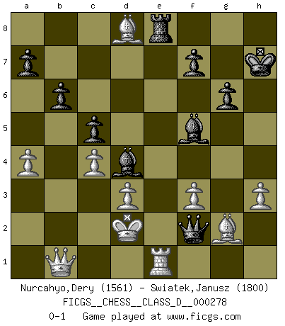 Last move : 0-1 2021 August 16 14:1:12 [Event "FICGS__CHESS__CLASS_D__000278"] [Site "FICGS"] [Date "2021.07.02"] [Round "1"] [White "Nurcahyo,Dery"] [Black "Swiatek,Janusz"] [Result "0-1"] [WhiteElo "1561"] [BlackElo "1800"] 1.e4 c5 2.c3 Nf6 3.d3 g6 4.Nf3 d6 5.Na3 Bg7 6.Be3 O-O 7.Be2 Nc6 8.O-O b6 9.h3 e5 10.Qa4 Bd7 11.Qc2 h6 12.Qc1 Kh7 13.Nc4 Qc7 14.Na3 d5 15.Nb5 Qb7 16.exd5 Nxd5 17.Bd2 Rad8 18.c4 Nf6 19.Rd1 Bf5 20.Be3 Qe7 21.Nc3 Nd4 22.Bf1 Nxf3+ 23.gxf3 Nh5 24.Nd5 Qh4 25.Kh2 Nf4 26.Nxf4 exf4 27.Bxf4 Qxf2+ 28.Bg2 Bxb2 29.Bg3 Qd4 30.Qb1 h5 31.a4 h4 32.Bxh4 Bxa1 33.Bxd8 Qf4+ 34.Kh1 Be5 35.Kg1 Qh2+ 36.Kf1 Bd4 37.Re1 Qg1+ 38.Ke2 Re8+ 39.Kd2 Qf2+ 0-1 Sicilian : Alapin's variation (2.c3) Kingside Castling by player Black (move 6) Kingside Castling by player White (move 8) Player Black won this chess game. Follow this game move after move (download)The laws of Chess do not permit a free choice: you have to move whether you like it or not. (Emanuel Lasker) Schach ist ein schwarz-weisser Dschungel. (Garry Kasparov) Yo he agregado estos principios a la ley: pongan los Caballos en acción antes de que los dos Alfiles sean desarrollados. (Emanuel Lasker) Les Echecs ne sont pas pour les âmes timides. Ils requièrent un homme entier, qui ne s'arrête pas aveuglément à ce qui a été déjà établi, mais qui tente individuellement de sonder les profondeurs du jeu. (W. Steinitz) Thibault, I ask for draw. Game 13876. - Sorry Ilmars, you won. (FICGS chat)