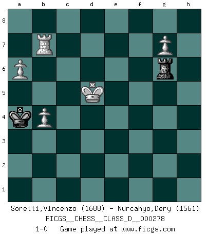 Last move : 1-0 2021 October 8 15:36:45 [Event "FICGS__CHESS__CLASS_D__000278"] [Site "FICGS"] [Date "2021.07.02"] [Round "1"] [White "Soretti,Vincenzo"] [Black "Nurcahyo,Dery"] [Result "1-0"] [WhiteElo "1688"] [BlackElo "1561"] 1.d4 c6 2.c4 Nf6 3.Nc3 h6 4.e4 d6 5.Nf3 Na6 6.Be2 e6 7.O-O Be7 8.e5 Nd7 9.Bf4 dxe5 10.Nxe5 O-O 11.a3 Nxe5 12.dxe5 Qb6 13.Qc2 Qd4 14.Qe4 Rd8 15.Rad1 Qb6 16.Bd3 f5 17.exf6 Bxf6 18.Qh7+ Kf7 19.Bxh6 Rg8 20.Bc1 Bd7 21.Qh5+ Ke7 22.Qe2 Qc7 23.Rfe1 Rh8 24.g3 Nc5 25.Bc2 e5 26.Ne4 Nxe4 27.Qxe4 Be6 28.f4 Qb6+ 29.Qe3 Qxe3+ 30.Bxe3 Bxc4 31.Bc5+ Kf7 32.fxe5 Be7 33.Rd7 Rae8 34.Rxb7 Rhf8 35.Rxa7 Ke6 36.Bxe7 Rxe7 37.Rxe7+ Kxe7 38.b3 Bd5 39.b4 Ra8 40.Re3 Rf8 41.h3 Ke6 42.g4 g5 43.Bf5+ Ke7 44.e6 Ra8 45.Kf2 Rd8 46.Rd3 Rd6 47.Re3 Bc4 48.Rc3 Bb5 49.Kg3 Rd8 50.Kf3 Rd1 51.Ke3 Rh1 52.Kd4 Kd6 53.Re3 Rd1+ 54.Bd3 Bxd3 55.Rxd3 Re1 56.e7 Rxe7 57.a4 Re5 58.Rc3 Rd5+ 59.Kc4 Ke5 60.Kb3 Kd6 61.a5 Kc7 62.Rf3 Kb7 63.Rf5 Rd3+ 64.Kc4 Rxh3 65.Rxg5 Rh6 66.Rg7+ Ka6 67.g5 Re6 68.g6 Re5 69.Rc7 Re6 70.g7 Rg6 71.Kc5 Rg5+ 72.Kxc6 Rg6+ 73.Kd5 Kb5 74.Rb7+ Ka4 75.a6 1-0 Queen's pawn Kingside Castling by player White (move 7) Kingside Castling by player Black (move 10) 10 pieces endgame at move 56 : White KRPPPP , Black KRPP WHITE : King + 1 Rook 4 Pawns BLACK : King + 1 Rook 2 Pawns 9 pieces endgame at move 64 : White KRPPP , Black KRPP WHITE : King + 1 Rook 3 Pawns BLACK : King + 1 Rook 2 Pawns 8 pieces endgame at move 65 : White KRPPP , Black KRP WHITE : King + 1 Rook 3 Pawns BLACK : King + 1 Rook 1 Pawn 7 pieces endgame at move 72 : White KRPPP , Black KR WHITE : King + 1 Rook 3 Pawns BLACK : King + 1 Rook Player White won this chess game. Follow this game move after move (download)The passed pawn is a criminal, who should be kept under lock and key. Mild measures, such as police surveillance, are not sufficient. (Nimzovitch) Smyslow ist ein Beweis dafür, dass ich noch zehn Jahre spielen kann! [der 75 jährige über den 85 jährigen] (Viktor Kortschnoi) Fischer sacrificó virtualmente todo lo que la mayoría de nosotros los 'debiles' (término que él usa) valoramos, respetamos y apreciamos por el amor de un astuto, a menudo hermoso tablero de juego, por el privilegio ambivalente de ser su mas grande maestro. (Paul Kollar) Shah mat. Le roi est mort. Cri de fierté d'un joueur venant de terrasser son adversaire, courtoisement, sans effusion de sang. The worth of a book is to be measured by what you can carry away from it. (James Bryce)