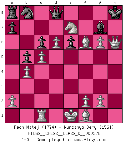 Last move : 1-0 2021 November 18 3:13:32 [Event "FICGS__CHESS__CLASS_D__000278"] [Site "FICGS"] [Date "2021.07.02"] [Round "1"] [White "Pech,Matej"] [Black "Nurcahyo,Dery"] [Result "1-0"] [WhiteElo "1774"] [BlackElo "1561"] 1.e4 c6 2.d4 Nf6 3.e5 Nd5 4.c4 Nb6 5.Nc3 e6 6.Nf3 h6 7.Be3 d6 8.exd6 N6d7 9.c5 g6 10.b4 b6 11.Rc1 Bg7 12.Qd2 b5 13.d5 exd5 14.Nxd5 O-O 15.Ne7+ Kh7 16.h4 Nf6 17.Ng5+ Kh8 18.h5 Ng8 19.hxg6 Be6 20.Nxe6 fxe6 21.Bxh6 Rf6 22.Bg5 Nh6 23.Rxh6+ Bxh6 24.Bxf6+ Bg7 25.Qh6+ 1-0 Caro-Masi defense Kingside Castling by player Black (move 14) Player White won this chess game. Follow this game move after move (download)It is not a move, even the best move that you must seek, but a realizable plan. (Eugene Znosko-Borovsky) Dass jemand wie Surab Asmaiparaschwili, der selbst Elopunkte gekauft hat , Vize-Präsident der Fide werden konnte, sagt schon einges über den Zustand dieser Organisation aus. (Joel Lautier) Vive, pierde y aprende al observar a tu oponente como gana. (Amber Steenbock) L'action d'une oeuvre littéraire se déroule sur un champ de bataille. Les masques et les types du drame moderne correspondent aux pièces du jeu d'échecs. L'intrigue correspond aux coups et aux gambits, c'est à dire aux techniques du jeu telles qu'utilisées et interprétées par les joueurs. Les tactiques et les péripéties [mouvements] correspondent aux coups exécutés par l'adversaire. (Viktor Shklovsky) However beautiful the strategy, you should occasionally look at the results. (Winston Churchill)