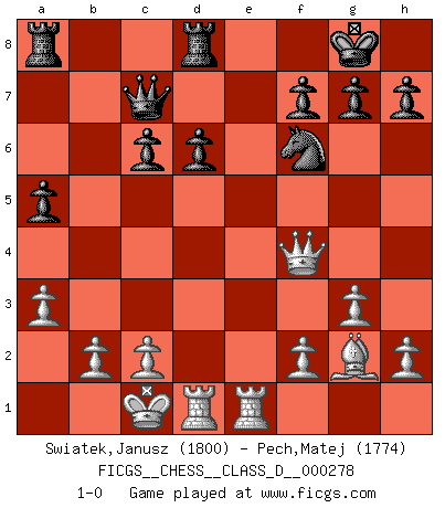 Last move : 1-0 2021 September 28 3:19:59 [Event "FICGS__CHESS__CLASS_D__000278"] [Site "FICGS"] [Date "2021.07.02"] [Round "1"] [White "Swiatek,Janusz"] [Black "Pech,Matej"] [Result "1-0"] [WhiteElo "1800"] [BlackElo "1774"] 1.e4 e5 2.Nf3 Nc6 3.d4 exd4 4.Nxd4 Bc5 5.Nb3 Bb6 6.Qe2 d6 7.Be3 Nf6 8.Nc3 Be6 9.O-O-O Qe7 10.g3 O-O 11.Bg2 Rfe8 12.Bxb6 axb6 13.a3 Na5 14.Nxa5 bxa5 15.Rhe1 c6 16.Qd2 Red8 17.Nd5 Bxd5 18.exd5 Qc7 19.dxc6 bxc6 20.Qf4 1-0 This chess game has been lost on time (started : 2021.07.02 22:12:4) Scotch : Potter variation Queenside Castling by player White (move 9) Kingside Castling by player Black (move 10) Player White won this chess game. Follow this game move after move (download)Castle early and often. (Rob Sillars) Frage: Wie viele Autos haben Sie schon zerstört? - Antwort: Nur zwei. (Loek van Wely) De todos mis libros Rusos, la defensa contiene y difunde el 'calor' mas grande que pudiese verse extraño al observar lo supremamente abstracto que el Ajedrez supuestamente es. (Vladimir Nabokov) Un journaliste : 'Vous préférez avoir une dame de plus sur l'échiquier ou au lit ?' Boris Spassky : 'Ca dépend de la position.' There are two types of people in this world, good and bad. The good sleep better, but the bad seem to enjoy the waking hours much more. (Woody Allen)