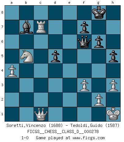 Last move : 1-0 2021 December 12 7:27:40 [Event "FICGS__CHESS__CLASS_D__000278"] [Site "FICGS"] [Date "2021.07.02"] [Round "1"] [White "Soretti,Vincenzo"] [Black "Tedoldi,Guido"] [Result "1-0"] [WhiteElo "1688"] [BlackElo "1587"] 1.e4 c5 2.Nf3 Nc6 3.d4 cxd4 4.Nxd4 e5 5.Nf3 Nf6 6.Nc3 d6 7.Be2 h6 8.O-O Be7 9.h3 O-O 10.Be3 Be6 11.Nd5 Nxe4 12.Nxe7+ Qxe7 13.Bd3 Nf6 14.Be2 Rfd8 15.c3 a6 16.Bb6 Rd7 17.b4 Rc8 18.b5 Nb8 19.bxa6 Nxa6 20.Bb5 Rxc3 21.Bxd7 Nxd7 22.Be3 Nf6 23.Bd2 Rc6 24.Re1 Nc5 25.Be3 Nce4 26.Nh2 d5 27.f3 Ng3 28.Bf2 Nfh5 29.Rxe5 g6 30.Qe1 Qc7 31.Bxg3 Nxg3 32.Qxg3 Rc1+ 33.Rxc1 Qxc1+ 34.Nf1 Qc5+ 35.Qf2 Qc3 36.Re3 Qa5 37.Qb2 Qa7 38.Kh1 Qa6 39.Nd2 h5 40.Ra3 Qc6 41.Rb3 Bc8 42.Rc3 Qe6 43.Kg1 b6 44.Qc1 Bb7 45.Nb3 Qd6 46.Nd4 b5 47.Nxb5 Qb6+ 48.Rc5 Ba6 49.a4 Bb7 50.Kh1 Qf6 51.Rc7 1-0 Sicilian : Labourdonnais-Loewenthal variation Kingside Castling by player White (move 8) Kingside Castling by player Black (move 9) Player White won this chess game. Follow this game move after move (download)A good player is always lucky. (Jose Raul Capablanca) Über Kasparov: Es ist offensichtlich, daß er in einem totalitären Staat aufwuchs und deshalb zu diktatorischen Zügen neigt. (Viktor Kortschnoi) La pasion por jugar al Ajedrez es una de las mas inexplicables en el mundo. (H.G. Wells) Il n'y a pas de prix trop élevé au scalp de l'ennemi. (Koblentz) Internet: Absolute communication, absolute isolation. (Paul Carvel)