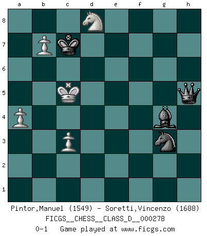 Last move : 0-1 2021 August 13 2:40:29 [Event "FICGS__CHESS__CLASS_D__000278"] [Site "FICGS"] [Date "2021.07.02"] [Round "1"] [White "Pintor,Manuel"] [Black "Soretti,Vincenzo"] [Result "0-1"] [WhiteElo "1549"] [BlackElo "1688"] 1.e4 e5 2.f4 exf4 3.Nf3 g5 4.Bc4 Qe7 5.d3 Nc6 6.O-O d6 7.c3 Bd7 8.Nxg5 Qxg5 9.Bxf4 Qg4 10.Bxf7+ Kxf7 11.Bxd6 Nf6 12.Bxc7 Qxd1 13.Rxd1 Bc5+ 14.d4 Bb6 15.Bxb6 axb6 16.Rf1 Ke7 17.e5 Nd5 18.Nd2 Raf8 19.Ne4 Rxf1+ 20.Rxf1 Rf8 21.Rxf8 Kxf8 22.Nd6 Nd8 23.g3 h5 24.Kf2 Bg4 25.Ne4 Kg7 26.a3 b5 27.Nd6 Bd7 28.Kf3 Bg4+ 29.Ke4 Nb6 30.Nxb5 Nc4 31.b4 Nd2+ 32.Kd5 Nf1 33.Nc7 Nxh2 34.e6 Kf6 35.Kd6 Nxe6 36.Ne8+ Kf7 37.d5 Nf1 38.dxe6+ Bxe6 39.Nc7 Bg4 40.Kc5 Nxg3 41.Nb5 h4 42.Nd6+ Ke6 43.Nxb7 h3 44.b5 h2 45.b6 h1Q 46.Nd8+ Kd7 47.b7 Kc7 48.a4 Qh5+ 0-1 KGA : King's knight's gambit Kingside Castling by player White (move 6) 10 pieces endgame at move 40 : White KNPPP , Black KBNPP WHITE : King + 1 Knight 3 Pawns BLACK : King + 1 Bishop 1 Knight 2 Pawns 9 pieces endgame at move 43 : White KNPPP , Black KBNP WHITE : King + 1 Knight 3 Pawns BLACK : King + 1 Bishop 1 Knight 1 Pawn Promotion Queen by player Black (move 45) Player Black won this chess game. Follow this game move after move (download)Why must I lose to this idiot ? (Aron Nimzovich) Capablanka war das größte Genie der Schachgeschichte! Aber denken sie nicht er habe nichts vom Schach verstanden. Er wusste nur soviel wie er wissen musste um seine Ziele zu erreichen. (Mikhail Moiseyevich Botvinik) Yo he agregado estos principios a la ley: pongan los Caballos en acción antes de que los dos Alfiles sean desarrollados. (Emanuel Lasker) Psychologiquement, tu dois avoir confiance en toi même, mais cette confiance doit être basée sur des faits. (Robert Fischer) Perhaps the current trend of many chess professionals taking up the more lucrative pastime of poker is not a wholly negative one. It may not be too late for humans to relearn how to take risks in order to innovate and thereby maintain the advanced lifestyles we enjoy. And if it takes a poker-playing supercomputer to remind us that we can't enjoy the rewards without taking the risks, so be it. (The Chess Master and the Computer, by Garry Kasparov - 2010)