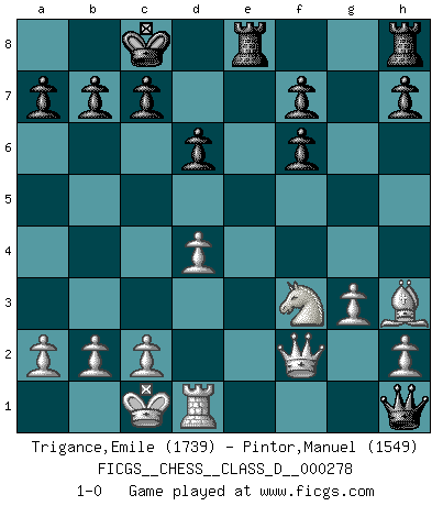 Last move : 1-0 2021 July 9 13:48:41 [Event "FICGS__CHESS__CLASS_D__000278"] [Site "FICGS"] [Date "2021.07.02"] [Round "1"] [White "Trigance,Emile"] [Black "Pintor,Manuel"] [Result "1-0"] [WhiteElo "1739"] [BlackElo "1549"] 1.e4 e5 2.f4 Bc5 3.Nf3 Nc6 4.fxe5 Nxe5 5.Nxe5 Qh4+ 6.g3 Qxe4+ 7.Qe2 Qxh1 8.d4 Be7 9.Nf3 d6 10.Be3 Bg4 11.Nbd2 O-O-O 12.O-O-O Bg5 13.Bxg5 Nf6 14.Bxf6 Bxf3 15.Nxf3 Rde8 16.Qf2 gxf6 17.Bh3+ 1-0 KGD : Classical variation Queenside Castling by player Black (move 11) Queenside Castling by player White (move 12) Player White won this chess game. Follow this game move after move (download)Many have become Chess Masters, no one has become the Master of Chess. (Siegbert Tarrasch) Wie kann ich Remis annehmen? Ich weiß ja gar nicht, wie ich stehe! (Fritz Sämisch) El Ajedrez es 99 por ciento táctica. (Teichmann) Dans le domaine de la peinture, de la gravure et de la sculpture, dès la première décennie de notre siècle, les artistes abandonnent la représentation de la partie d'échecs pour se concentrer sur les pièces, sur les échiquiers et sur toutes les variations auxquelles les unes et les autres peuvent donner lieu. On passe en quelque sorte d'un thème social à un thème musical (au sens de la musica médiévale, c'est-à-dire d'une notion qui inclue le rythme, l'harmonie, la construction et la déconstruction, etc.). Graphiquement et picturalement, l'échiquier apparaît comme une structure ouverte, dynamique, d'une richesse infinie, autorisant toutes les combinatoires et débouchant sur des mouvements et des rythmes de nature exponentielle. (Michel Pastoureau) When you stop learning you start dying. (M. Scott Adams)