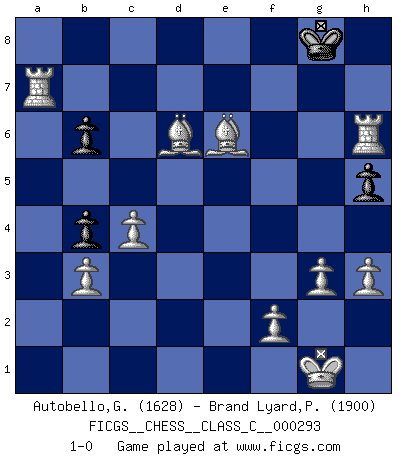Last move : 1-0 2021 November 15 20:29:16 [Event "FICGS__CHESS__CLASS_C__000293"] [Site "FICGS"] [Date "2021.07.02"] [Round "1"] [White "Autobello,Giovanni"] [Black "Brand Lyard,Paul"] [Result "1-0"] [WhiteElo "1628"] [BlackElo "1900"] 1.e4 Nc6 2.d4 d5 3.exd5 Nb4 4.c4 Bf5 5.Na3 Qd6 6.g3 c5 7.Bf4 Qb6 8.Nf3 cxd4 9.Nxd4 Be4 10.Nf3 Bxf3 11.Qxf3 Nc2+ 12.Nxc2 Qxb2 13.Qb3 Qxb3 14.axb3 Nf6 15.Bg2 a5 16.O-O Ng4 17.h3 Nf6 18.Rfe1 h5 19.d6 Ra7 20.dxe7 Bxe7 21.Bd6 b6 22.Bc6+ Kf8 23.Bb8 Ra6 24.Bb7 Bb4 25.Nxb4 axb4 26.Rxa6 Nd7 27.Bd6+ Kg8 28.Re8+ Kh7 29.Be4+ g6 30.Re7 Nf6 31.Rxf7+ Kh6 32.Rxf6 Re8 33.Rxg6+ Kh7 34.Ra7+ Kh8 35.Rh6+ Kg8 36.Bd5+ Re6 37.Bxe6+ 1-0 KP : Nimzovich defense Kingside Castling by player White (move 16) Player White won this chess game. Follow this game move after move (download)No other master has such a terrific will to win. At the board he radiates danger, and even the strongest opponents tend to freeze, like rabbits when they smell a panther. Even his weaknesses are dangerous. As white, his opening game is predictable - you can make plans against it - but so strong that your plans almost never work. In the middle game his precision and invention are fabulous, and in the end game you simply cannot beat him. (Anonymous German Expert) Ein Buch ist ein Spiegel; wenn ein Affe hineinsieht, so kann kein Apostel heraus gucken. (Georg Christoph Lichtenberg) Un jugador que es sorprendido, esta derrotado a medias. (Proverbio) Le succès, c'est être capable d'aller d'échec en échec sans perdre son enthousiasme. (Winston Churchill) You know what they say : You lie down with the Devil, you wake up in Hell. (Horatio Caine, C.S.I. Miami)