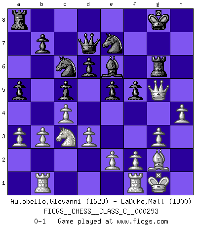 Last move : 0-1 2021 September 26 7:31:32 [Event "FICGS__CHESS__CLASS_C__000293"] [Site "FICGS"] [Date "2021.07.02"] [Round "1"] [White "Autobello,Giovanni"] [Black "LaDuke,Matt"] [Result "0-1"] [WhiteElo "1628"] [BlackElo "1900"] 1.c4 g6 2.Nc3 Bg7 3.g3 c5 4.Bg2 Nc6 5.Nf3 d6 6.O-O e5 7.d3 Nge7 8.Rb1 O-O 9.a3 a5 10.h3 h6 11.b3 Be6 12.Bd2 f5 13.Qc1 g5 14.Nxg5 hxg5 15.Bxg5 Bf6 16.h4 Qd7 17.Bxf6 Rxf6 18.Qg5+ Rg6 0-1 This chess game has been lost on time (started : 2021.07.02 22:14:16) English Opening Kingside Castling by player White (move 6) Kingside Castling by player Black (move 8) Player Black won this chess game. Follow this game move after move (download)I prefer to lose a really good game than to win a bad one. (David Levy) Ich hatte Zahnschmerzen im ersten Spiel. In der zweiten Partie tat mir der Kopf weh. In der dritten war es eine Rheuma-Attacke und während der vierten fühlte ich mich nicht gut. Und in der fünften? Nun, man muss doch nicht jedes Spiel gewinnen, oder? (Savielly Grigorievitsch Tartakower) El Ajedrez es un expediente tonto que hace creer a la gente inactiva que hacen una cosa muy astuta cuando solamente estan perdiendo su tiempo. (George Bernard Shaw) Fischer est le meilleur joueur du monde et Karpov n'est qu'un joueur de bistrot. (Garry Kasparov, agé de 16 ans) Train yourself to let go of everything you fear to lose. (Master Yoda in Star Wars ep.3)