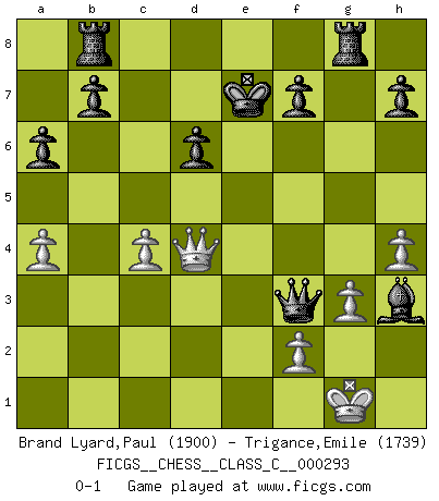 Last move : 0-1 2021 July 22 16:37:12 [Event "FICGS__CHESS__CLASS_C__000293"] [Site "FICGS"] [Date "2021.07.02"] [Round "1"] [White "Brand Lyard,Paul"] [Black "Trigance,Emile"] [Result "0-1"] [WhiteElo "1900"] [BlackElo "1739"] 1.d4 Nf6 2.Bg5 c5 3.Bxf6 gxf6 4.dxc5 Qa5+ 5.Nd2 Qxc5 6.e4 d6 7.c3 Nd7 8.Bc4 Ne5 9.b3 Nxc4 10.bxc4 Bg7 11.Rb1 a6 12.a4 Qc7 13.Ngf3 Rb8 14.h4 f5 15.exf5 Bxf5 16.Rb4 Bxc3 17.Rb3 Qa5 18.Rxc3 Qxc3 19.O-O Rg8 20.g3 Bg4 21.Ne4 Qxf3 22.Nxd6+ exd6 23.Re1+ Kd7 24.Qd4 Bh3 25.Re7+ Kxe7 0-1 Trompowsky attack (Ruth, Opovcensky Opening) Kingside Castling by player White (move 19) Player Black won this chess game. Follow this game move after move (download)In complicated positions, Bobby Fischer hardly had to be afraid of anybody. (Paul Keres) Es ist wirklich schade, dass so viele Schachspieler nicht auf ihr Äußeres achten! (Alexandra Kosteniuk) El pensamiento metódico es mas útil en el Ajedrez que la inspiración. (C. J. S. Purdy) Aux échecs, les retours au sommet sont rares : les dommages psychologiques consécutifs à une défaite sont trop sévères. (Daily Telegraph) Memory is a crazy woman that hoards colored rags and throws away food. (Austin O'Malley)