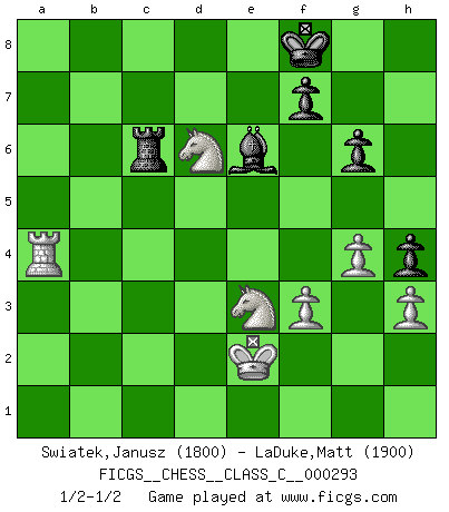 Last move : 1/2-1/2 2021 August 23 17:37:18 [Event "FICGS__CHESS__CLASS_C__000293"] [Site "FICGS"] [Date "2021.07.02"] [Round "1"] [White "Swiatek,Janusz"] [Black "LaDuke,Matt"] [Result "1/2-1/2"] [WhiteElo "1800"] [BlackElo "1900"] 1.e4 e5 2.Nf3 Nc6 3.Bb5 a6 4.Ba4 Nf6 5.O-O Be7 6.Re1 b5 7.Bb3 O-O 8.c3 d6 9.h3 Bb7 10.d4 Re8 11.Ng5 Rf8 12.Nf3 Re8 13.Nbd2 Bf8 14.d5 Nb8 15.a4 Nbd7 16.c4 c6 17.axb5 cxd5 18.cxd5 axb5 19.Rxa8 Qxa8 20.Bc2 Rc8 21.b4 Nb6 22.Nf1 Qa2 23.Bd3 Nc4 24.N3d2 Nb2 25.Bxb2 Qxb2 26.Qa1 Qxb4 27.Rb1 Qc3 28.Qxc3 Rxc3 29.Bxb5 g6 30.f3 Bc8 31.Kf2 Rc2 32.g4 h5 33.Ke2 h4 34.Bc4 Rc3 35.Rb8 Bd7 36.Ra8 Kg7 37.Ra7 Be8 38.Ra1 Kh7 39.Ra8 Bh6 40.Ra6 Nd7 41.Rxd6 Nc5 42.Rd8 Ba4 43.Ra8 Bg5 44.d6 Bd7 45.Ra5 Ne6 46.Bxe6 Bxe6 47.Rxe5 Kh6 48.Rb5 Bf4 49.e5 Kg7 50.Ra5 Kf8 51.Ra4 Bxe5 52.Ne4 Rc6 53.Ne3 Bxd6 54.Nxd6 1/2-1/2 Ruy Lopez : Closed, 7...O-O Kingside Castling by player White (move 5) Kingside Castling by player Black (move 7) This chess game ended in a draw. Follow this game move after move (download)If cunning alone were needed to excel, women would be the best Chess players. (Albin) Ich hatte Angst gegen einen russischen Großmeister zu verlieren, und er befürchtete gegen einen kleinen Jungen zu verlieren. (über ein Remis gegen Juri Awerbach). (Robert James Fischer) Solo existe una cosa que Fischer hace en el Ajedrez sin placer: ¡perder!. (Boris Spassky) Il n'y a pas de prix trop élevé au scalp de l'ennemi. (Koblentz) The message for business people contemplating their place in the cyberspace is simple and direct: get linked or get lost. (Vic Sussman and Kenan Pollack)