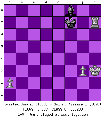 Last move : 1-0 2021 November 9 14:35:41 [Event "FICGS__CHESS__CLASS_C__000293"] [Site "FICGS"] [Date "2021.07.02"] [Round "1"] [White "Swiatek,Janusz"] [Black "Suwara,Kazimierz"] [Result "1-0"] [WhiteElo "1800"] [BlackElo "1876"] 1.e4 e5 2.Nf3 Nc6 3.d4 exd4 4.Nxd4 Bc5 5.Nb3 Bb4+ 6.c3 Be7 7.f4 Nf6 8.Bd3 d6 9.O-O O-O 10.N1d2 Re8 11.Nf3 Bf8 12.Qc2 g6 13.Bd2 a6 14.Rae1 b5 15.e5 dxe5 16.fxe5 Nd5 17.Ng5 Be6 18.h4 Bg7 19.Nc5 Nxe5 20.Ncxe6 Rxe6 21.Nxe6 fxe6 22.Bg5 Qd6 23.Be4 b4 24.Bxd5 exd5 25.Bf4 Rf8 26.Qe2 Re8 27.h5 h6 28.cxb4 Qxb4 29.Qd1 c6 30.hxg6 Re7 31.Bxe5 Bxe5 32.Qf3 Kg7 33.g3 Qd6 34.Kg2 Bf6 35.Rxe7+ Qxe7 36.b4 Kxg6 37.Qf5+ Kg7 38.Qg4+ Bg5 39.Rf2 Qd6 40.Rc2 Kf6 41.Qc8 Qxb4 42.Rxc6+ Kg7 43.Qd7+ Be7 44.Re6 Kf7 45.Qxd5 Kg7 46.Kh3 Qc5 47.Qxc5 Bxc5 48.Rxa6 Kf7 49.Rxh6 Bf8 50.Rh7+ 1-0 Scotch : Romanishin variation Kingside Castling by player White (move 9) Kingside Castling by player Black (move 9) 10 pieces endgame at move 45 : White KQRPP , Black KQBPP WHITE : King + 1 Queen 1 Rook 2 Pawns BLACK : King + 1 Queen 1 Bishop 2 Pawns 9 pieces endgame at move 47 : White KQRPP , Black KBPP WHITE : King + 1 Queen 1 Rook 2 Pawns BLACK : King + 1 Bishop 2 Pawns 8 pieces endgame at move 47 : White KRPP , Black KBPP WHITE : King + 1 Rook 2 Pawns BLACK : King + 1 Bishop 2 Pawns 7 pieces endgame at move 48 : White KRPP , Black KBP WHITE : King + 1 Rook 2 Pawns BLACK : King + 1 Bishop 1 Pawn 6 pieces endgame at move 49 : White KRPP , Black KB WHITE : King + 1 Rook 2 Pawns BLACK : King + 1 Bishop Player White won this chess game. Follow this game move after move (download)Only the player with the initiative has the right to attack. (Wilhelm Steinitz) Es ist im Leben wie im Schachspiel. Wir entwerfen einen Plan, dieser bleibt jedoch bedingt durch das, was im Schachspiel dem Gegner, im Leben dem Schicksal zu tun belieben wird. (Arthur Schopenhauer) Me dio la sensación de como si yo estuviera jugando en contra del mismo Ajedrez. - al estar jugando en contra de Robert Fischer (Walter Shipman) Lorsque vous vous retrouvez devant une position atroce, ne tendez pas un ultime piège dérisoire avec l'intention d'abandonner si l'adversaire le déjoue ! Faites-vous plutôt un devoir de résister comme si votre vie en dépendait. Jouez le coup qui vous déplairait au centuple si vous étiez dans la peau de votre tortionnaire ! For a mechanic, you seem to do an excessive amount of thinking. (C-3PO in Star Wars ep.2)