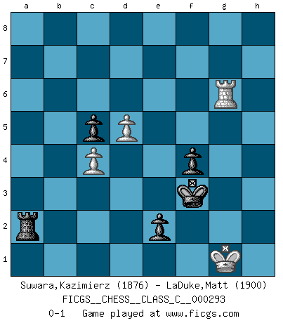 Last move : 0-1 2021 December 10 13:55:13 [Event "FICGS__CHESS__CLASS_C__000293"] [Site "FICGS"] [Date "2021.07.02"] [Round "1"] [White "Suwara,Kazimierz"] [Black "LaDuke,Matt"] [Result "0-1"] [WhiteElo "1876"] [BlackElo "1900"] 1.e4 e5 2.Nf3 Nc6 3.Bb5 a6 4.Ba4 Nf6 5.O-O Be7 6.d3 b5 7.Bb3 d6 8.c3 O-O 9.Nbd2 Na5 10.Bc2 c5 11.Re1 Nc6 12.Nf1 Be6 13.Qe2 a5 14.Ne3 a4 15.a3 h6 16.c4 bxc4 17.dxc4 Qd7 18.Nd5 Rfb8 19.Qd3 Bg4 20.Rb1 Bxf3 21.Qxf3 Nxd5 22.exd5 Nd4 23.Qd1 Bg5 24.Bxg5 hxg5 25.b3 axb3 26.Bxb3 Rxa3 27.Bc2 Rba8 28.Rb2 g6 29.Bb1 Qe7 30.h3 Rc3 31.Bd3 Kg7 32.Bf1 Rca3 33.Qg4 f5 34.Qd1 e4 35.Re3 Ra1 36.Rb1 R1a2 37.Qe1 Kh6 38.Bd3 R8a3 39.Rd1 Qe5 40.Kh1 Rb3 41.Bb1 Rxe3 42.Qxe3 Re2 43.Qg3 Qxg3 44.fxg3 f4 45.gxf4 gxf4 46.Kg1 e3 47.Be4 Kg5 48.Ra1 Rf2 49.Bf3 Nxf3+ 50.gxf3 Kh4 51.Ra6 Kxh3 52.Rxd6 Ra2 53.Kf1 Kg3 54.Rxg6+ Kxf3 55.Kg1 e2 0-1 Ruy Lopez : Closed defense Kingside Castling by player White (move 5) Kingside Castling by player Black (move 8) 10 pieces endgame at move 54 : White KRPPP , Black KRPPP WHITE : King + 1 Rook 3 Pawns BLACK : King + 1 Rook 3 Pawns 9 pieces endgame at move 54 : White KRPP , Black KRPPP WHITE : King + 1 Rook 2 Pawns BLACK : King + 1 Rook 3 Pawns Player Black won this chess game. Follow this game move after move (download)No price is too great for the scalp of the enemy King. (Koblentz) Ein Schachspiel besteht aus drei Phasen: Die erste, wenn du hofftst den Vorteil zu haben, die zweite, wenn du glaubst einen Vorteil zu haben, und die dritte.... wenn du weißt Du wirst verlieren. (Savielly Grigorievitsch Tartakower) El Ajedrez es tortura mental. (Garry Kasparov) La vérité est comme le meilleur coup aux échecs : elle existe, mais il faut la chercher. (Arturo Perez-Reverte) Plans are ideas that never come to fruition. (Daniel Parmet)
