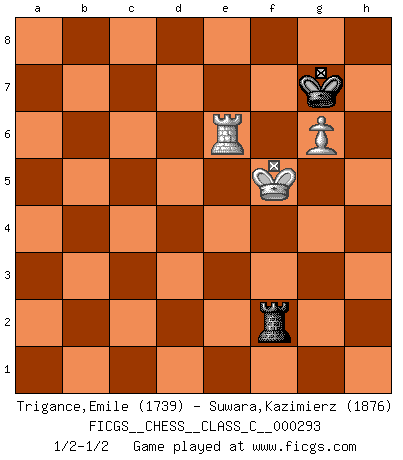 Last move : 1/2-1/2 2021 December 11 9:43:20 [Event "FICGS__CHESS__CLASS_C__000293"] [Site "FICGS"] [Date "2021.07.02"] [Round "1"] [White "Trigance,Emile"] [Black "Suwara,Kazimierz"] [Result "1/2-1/2"] [WhiteElo "1739"] [BlackElo "1876"] 1.e4 e5 2.f4 d5 3.exd5 e4 4.d3 Nf6 5.dxe4 Nxe4 6.Nf3 Bc5 7.Qe2 Bf2+ 8.Kd1 Qxd5+ 9.Nfd2 f5 10.Nc3 Qd4 11.Ncxe4 fxe4 12.c3 Qe3 13.Qh5+ Kf8 14.Bc4 Qxf4 15.Qd5 Qg4+ 16.Kc2 Ke8 17.Qf7+ Kd8 18.Qxf2 Bf5 19.Qe3 Nd7 20.Rf1 Bg6 21.g3 Kc8 22.b3 Qh3 23.Rf2 Qh6 24.Re2 Qxe3 25.Rxe3 Nf6 26.Be6+ Kb8 27.c4 a5 28.Bb2 Re8 29.Bh3 Ra6 30.Rae1 Rd6 31.Bxf6 gxf6 32.Nxe4 Rd4 33.Bg2 f5 34.Kc3 Rdxe4 35.Bxe4 fxe4 36.g4 Rf8 37.h4 h6 38.g5 hxg5 39.hxg5 Rf2 40.R1e2 Rf1 41.Rxe4 Bxe4 42.Rxe4 Rg1 43.Re5 Rg4 44.Rxa5 Kc8 45.Rd5 c6 46.Rc5 Rg2 47.a4 Kc7 48.a5 Rg3+ 49.Kc2 Rf3 50.b4 Kd6 51.Kb2 Rf2+ 52.Kc3 Rg2 53.Kd3 Rg4 54.Rf5 Ke6 55.Rc5 Kd6 56.Ke3 Rh4 57.Kf3 Ke6 58.b5 cxb5 59.cxb5 Ra4 60.a6 bxa6 61.Rc6+ Kd7 62.Rxa6 Rb4 63.b6 Ke6 64.g6 Kf6 65.b7 Kg7 66.Re6 Rxb7 67.Kf4 Rb2 68.Kf3 Rh2 69.Kg4 Rg2+ 70.Kf5 Rf2+ 1/2-1/2 KGD : Falkbeer, 5.de 10 pieces endgame at move 44 : White KRPPPP , Black KRPP WHITE : King + 1 Rook 4 Pawns BLACK : King + 1 Rook 2 Pawns 9 pieces endgame at move 58 : White KRPPP , Black KRPP WHITE : King + 1 Rook 3 Pawns BLACK : King + 1 Rook 2 Pawns 8 pieces endgame at move 59 : White KRPPP , Black KRP WHITE : King + 1 Rook 3 Pawns BLACK : King + 1 Rook 1 Pawn 7 pieces endgame at move 60 : White KRPP , Black KRP WHITE : King + 1 Rook 2 Pawns BLACK : King + 1 Rook 1 Pawn 6 pieces endgame at move 62 : White KRPP , Black KR WHITE : King + 1 Rook 2 Pawns BLACK : King + 1 Rook 5 pieces endgame at move 66 : White KRP , Black KR WHITE : King + 1 Rook 1 Pawn BLACK : King + 1 Rook This chess game ended in a draw. Follow this game move after move (download)Chess is a terrible game. If you have no center, your opponent has a freer position. If you do have a center, then you really have something to worry about ! (Siegbert Tarrasch) Wir können eben der zündenden Macht des Opfers nicht wiederstehen, denn die Begeisterung für das Opfer liegt in der Natur des Menschen. (Rudolf Spielmann) La batalla por la última verdad nunca sera ganada. Y es por eso que el Ajedrez es tan fascinante. (Hans Kmoch) Il vaut mieux sacrifier les pièces de l'adversaire. (Xavier Tartacover) 98% of all statistics are made up. (Author unknown)