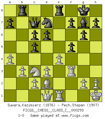 Last move : 1-0 2021 October 24 14:3:53 [Event "FICGS__CHESS__CLASS_C__000293"] [Site "FICGS"] [Date "2021.07.02"] [Round "1"] [White "Suwara,Kazimierz"] [Black "Pech,Stepan"] [Result "1-0"] [WhiteElo "1876"] [BlackElo "1907"] 1.e4 c5 2.f4 Nc6 3.Nf3 g6 4.Bb5 Bg7 5.Bxc6 bxc6 6.d3 d6 7.O-O Nf6 8.Qe1 O-O 9.Nc3 Rb8 10.b3 Bg4 11.Bd2 Bxf3 12.Rxf3 e6 13.Qe2 Nd7 14.Kh1 Qb6 15.Re1 Rfe8 16.a4 Qc7 17.f5 exf5 18.Qd1 1-0 This chess game has been lost on time (started : 2021.07.02 22:14:16) Sicilian : Grand Prix attack Kingside Castling by player White (move 7) Kingside Castling by player Black (move 8) Player White won this chess game. Follow this game move after move (download)I have added these principles to the law: get the Knights into action before both Bishops are developed. (Emanuel Lasker) Schach ist eine Sache der genauen Beurteilung, wann man zuschlagen und wann man sich ducken muss. (Robert James Fischer) Robert Fischer es la ley hacia si mismo. (Larry Evans) Les échecs sont un jeu terrible. Si vous n'avez pas le centre, votre adversaire a une position plus libre. Par contre, si vous avez le centre, alors vous avez vraiment quelque chose pour laquelle vous inquiéter ! (Siegbert Tarrasch) When you have everything, sometimes it feels like nothing. (Horatio Caine, C.S.I. Miami)
