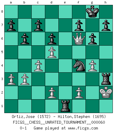 Last move : 0-1 2021 October 31 13:52:29 [Event "FICGS__CHESS__UNRATED_TOURNAMENT__000060"] [Site "FICGS"] [Date "2021.07.04"] [Round "1"] [White "Ortiz,Jose"] [Black "Hilton,Stephen"] [Result "0-1"] [WhiteElo "1572"] [BlackElo "1695"] 1.c4 g6 2.Nc3 e5 3.e4 Bg7 4.b3 Nf6 5.Bb2 O-O 6.h3 d6 7.Nge2 Nc6 8.a3 Be6 9.Qc2 Nd4 10.Nxd4 exd4 11.Nd5 Bxd5 12.exd5 Qe7+ 13.Be2 Rfe8 14.Qd3 Rad8 15.Bxd4 b6 16.O-O Qxe2 17.Qc3 Nh5 18.Rae1 Qxe1 19.Rxe1 Rxe1+ 20.Kh2 Rde8 21.g4 Bxd4 22.Qxd4 R8e4 23.Qc3 Nf4 24.Qf3 Rd4 25.Qc3 Rd3 26.Qf6 Rxh3+ 0-1 English Opening Kingside Castling by player Black (move 5) Kingside Castling by player White (move 16) Player Black won this chess game. Follow this game move after move (download)In blitz, the Knight is stronger than the Bishop. (Vlastimil Hort) Korrekt heißt in Deutschland die Haltung eines Mannes, dessen Benehmen nach dem Urteile seiner Nachbarn seiner Stellung angemessen ist. Um korrekt zu sein, muß man sich der Meinung der anderen anpassen... (Emanuel Lasker) El Ajedrez detiene a su maestro dentro de sus propios vínculos, encadenando la mente y el cerebro, por lo que la libertad interior del mas fuerte debe sufrir. (Albert Einstein) Le moment que je préfère le plus dans une rencontre, c'est celui où je sens que la personnalité de l'adversaire se brise. (Robert Fischer) It's not the size of the dog in the fight, it's the size of the fight in the dog. (Mark Twain)
