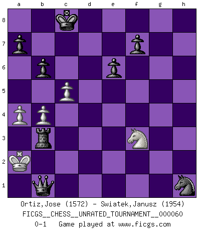 Last move : 0-1 2021 October 26 15:47:31 [Event "FICGS__CHESS__UNRATED_TOURNAMENT__000060"] [Site "FICGS"] [Date "2021.07.04"] [Round "1"] [White "Ortiz,Jose"] [Black "Swiatek,Janusz"] [Result "0-1"] [WhiteElo "1572"] [BlackElo "1954"] 1.e4 c5 2.Bc4 Nc6 3.c3 Nf6 4.d3 d5 5.exd5 Nxd5 6.Qf3 e6 7.Ne2 Ne5 8.Qh5 Nxc4 9.dxc4 Nf6 10.Qe5 Bd6 11.Qg5 h6 12.Qxg7 Rh7 13.Bxh6 Rxg7 14.Bxg7 Nh5 15.Bh6 b6 16.Nd2 Bb7 17.f3 Qh4+ 18.g3 Bxg3+ 19.Nxg3 Nxg3 20.O-O-O Nxh1 21.Be3 Qxh2 22.b4 cxb4 23.Bg1 Qe2 24.cxb4 O-O-O 25.a4 Bxf3 26.Be3 Qxd1+ 27.Kb2 Rd3 28.c5 Rxe3 29.Nxf3 Rb3+ 30.Ka2 Qb1+ 0-1 Sicilian defense Queenside Castling by player White (move 20) Queenside Castling by player Black (move 24) Player Black won this chess game. Follow this game move after move (download)Fischer is an American Chess tragedy on par with Morphy and Pillsbury. (Mig Greengard) Was ist der Unterschied zwischen einem Strassenarbeiter und einem Schachspieler? --Der Schachspieler bewegt sich ab und zu. (Anonymous) La belleza de un movimiento no se refleja solo en su apariencia, sino en el pensamiento detrás de él. (Siegbert Tarrasch) Il a essayé de se convaincre qu'il pourrait empêcher toutes les erreurs et ne jamais perdre. L'horreur ! Gary Kasparov au sujet de Robert Fischer. God is an atheist. (Unknown)