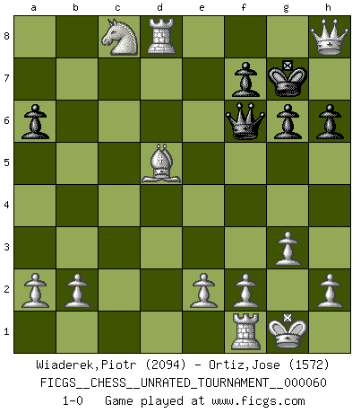 Last move : 1-0 2021 October 22 7:10:29 [Event "FICGS__CHESS__UNRATED_TOURNAMENT__000060"] [Site "FICGS"] [Date "2021.07.04"] [Round "1"] [White "Wiaderek,Piotr"] [Black "Ortiz,Jose"] [Result "1-0"] [WhiteElo "2094"] [BlackElo "1572"] 1.c4 c5 2.Nc3 d6 3.Nf3 Bd7 4.d4 a6 5.dxc5 Nc6 6.cxd6 exd6 7.g3 h6 8.Bg2 Nf6 9.Bf4 Be6 10.O-O Be7 11.Nd4 Bxc4 12.Nxc6 Qd7 13.Nxe7 Qxe7 14.Bxd6 Qe6 15.Bxb7 Rd8 16.Qa4+ Bb5 17.Nxb5 Rxd6 18.Nxd6+ Ke7 19.Rad1 Ne8 20.Nc8+ Kf8 21.Rd8 g6 22.Bd5 Qf6 23.Qxe8+ Kg7 24.Qxh8+ 1-0 English : Symmetrical variation Kingside Castling by player White (move 10) Player White won this chess game. Follow this game move after move (download)Chess, like any creative activity, can exist only through the combined efforts of those who have creative talent, and those who have the ability to organize their creative work. (Mikhail Botvinnik) Wenn du nicht weißt was du tun sollst, warte bis dein Gegner eine Idee hat. Sie wird sicher schlecht sein. (Siegbert Tarrasch) No hay precio que no valga la pena por la cabellera del Rey enemigo. (Koblentz) Karpov est une pièce de musée. (Garry Kasparov) The greatest con, that he ever pulled... was making you believe... that he is you. (Revolver, movie)