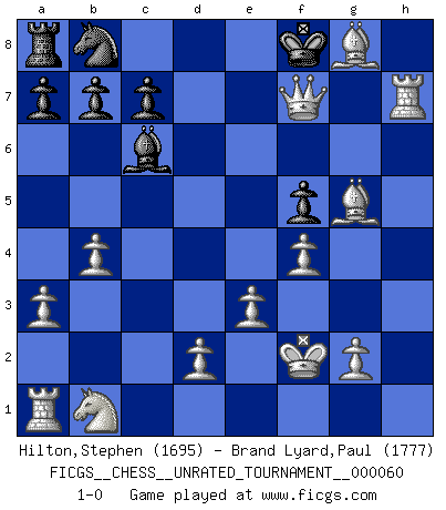 Last move : 1-0 2021 July 22 22:2:17 [Event "FICGS__CHESS__UNRATED_TOURNAMENT__000060"] [Site "FICGS"] [Date "2021.07.04"] [Round "1"] [White "Hilton,Stephen"] [Black "Brand Lyard,Paul"] [Result "1-0"] [WhiteElo "1695"] [BlackElo "1777"] 1.b4 f5 2.Bb2 Nf6 3.c4 e5 4.a3 d5 5.Bxe5 dxc4 6.e3 Ne4 7.Bxc4 g5 8.Bxh8 Nxf2 9.Kxf2 g4 10.Qb3 Bd6 11.Ne2 Bd7 12.Bg8 g3+ 13.hxg3 Qe7 14.Nf4 Bxf4 15.gxf4 Bc6 16.Rxh7 Qf8 17.Qe6+ Kd8 18.Bf6+ Qe7 19.Bxe7+ Ke8 20.Bg5 Kf8 21.Qf7+ 1-0 Polish (Sokolsky) opening Player White won this chess game. Follow this game move after move (download)The King is a fighting piece. Use it ! (Wilhelm Steinitz) Es ist besser die Steine des Gegners zu opfern. (Savielly Grigorievitsch Tartakower) Las combinaciones han sido siempre el aspecto más intrigante del Ajedrez. Los Maestros las buscan, el público las aplauden, los críticos las alaban. La razón se debe a que las combinaciones hacen posible que el Ajedrez sea más que un ejercicio matemático con una carencia de vida. Ellas son la poesía del juego, son del Ajedrez lo que la melodía es de la música. Ellas representan el triunfo de la mente sobre la materia. (Reuben Fine) Le génie consiste à savoir transgresser les règles au moment opportun. (Teichmann) The various flowers seem good to different people. (Chinese proverb)