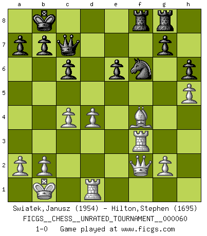 Last move : 1-0 2021 July 28 18:30:25 [Event "FICGS__CHESS__UNRATED_TOURNAMENT__000060"] [Site "FICGS"] [Date "2021.07.04"] [Round "1"] [White "Swiatek,Janusz"] [Black "Hilton,Stephen"] [Result "1-0"] [WhiteElo "1954"] [BlackElo "1695"] 1.e4 c6 2.d4 d5 3.Nc3 dxe4 4.Nxe4 Bf5 5.Ng3 Bg6 6.h4 h6 7.Nf3 e6 8.Ne5 Bh7 9.Bd3 Bxd3 10.Qxd3 Nf6 11.Bd2 Bd6 12.f4 Nbd7 13.O-O-O Qc7 14.Ne4 Nxe4 15.Qxe4 Nf6 16.Qe2 O-O-O 17.Rh3 Nd5 18.c4 Nf6 19.Kb1 Rhf8 20.h5 Nd7 21.Rg3 Bxe5 22.fxe5 Rg8 23.Ra3 Kb8 24.Rf3 Rdf8 25.Qf2 f6 26.exf6 Nxf6 27.Bf4 1-0 Caro-Kann : Classical, 6.h4 Queenside Castling by player White (move 13) Queenside Castling by player Black (move 16) Player White won this chess game. Follow this game move after move (download)It is always better to sacrifice your opponent's men. (Savielly Tartakower) Die Elozahlen sind sehr schlecht für das Schach. Jetzt ist Schach eine Sportindustrie, die darauf zielt Elopunkte zu machen. (Miguel Najdorf) Aquel que toma al Peón de Caballo de la Reina, se pasará la noche a dormir en la calle. (Anónimo) Les Cavaliers se révèlent fort utiles dans les positions fermées. D'habitude, les Fous sont un peu plus forts que les Cavaliers dans les positions ouvertes. Qu'on le veuille ou non, il restera toujours des exceptions ! A good book on your shelf is a friend that turns its back on you and remains a friend. (Author unknown)
