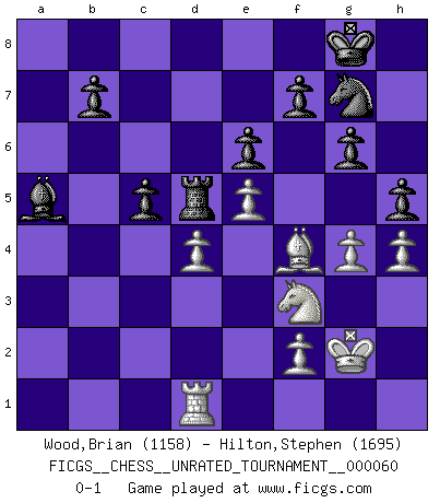Last move : 0-1 2021 September 15 20:48:7 [Event "FICGS__CHESS__UNRATED_TOURNAMENT__000060"] [Site "FICGS"] [Date "2021.07.04"] [Round "1"] [White "Wood,Brian"] [Black "Hilton,Stephen"] [Result "0-1"] [WhiteElo "1158"] [BlackElo "1695"] 1.d4 Nf6 2.c4 g6 3.Nc3 d5 4.Nf3 Bg7 5.Qb3 dxc4 6.Qxc4 O-O 7.e4 Nfd7 8.Bf4 c6 9.Be2 Nb6 10.Qb3 Be6 11.Qd1 Bc4 12.Bxc4 Nxc4 13.Qe2 Nb6 14.O-O N8d7 15.Rfd1 Nf6 16.e5 Nfd5 17.Nxd5 Nxd5 18.Bg3 e6 19.h4 Qb6 20.Rac1 Rfd8 21.a3 Ne7 22.b4 Rd5 23.Rc5 Rad8 24.Qe4 Nf5 25.Bh2 Bf8 26.Rxd5 Rxd5 27.g4 Ng7 28.Rc1 a5 29.Qb1 axb4 30.axb4 Bxb4 31.Rd1 Qa5 32.Qa1 h6 33.Qxa5 Bxa5 34.Kg2 c5 35.Bf4 h5 0-1 King's Indian defense, 3.Nc3 Kingside Castling by player Black (move 6) Kingside Castling by player White (move 14) Player Black won this chess game. Follow this game move after move (download)The battle for the ultimate truth will never be won. And that's why Chess is so fascinating. (Hans Kmoch) Ich verstehe mehr vom Schach als irgendein anderer lebender Meister. (José Raúl Capablanca) El Ajedrez demanda una total concentración. (Bobby Fischer) Dans le domaine de la peinture, de la gravure et de la sculpture, dès la première décennie de notre siècle, les artistes abandonnent la représentation de la partie d'échecs pour se concentrer sur les pièces, sur les échiquiers et sur toutes les variations auxquelles les unes et les autres peuvent donner lieu. On passe en quelque sorte d'un thème social à un thème musical (au sens de la musica médiévale, c'est-à-dire d'une notion qui inclue le rythme, l'harmonie, la construction et la déconstruction, etc.). Graphiquement et picturalement, l'échiquier apparaît comme une structure ouverte, dynamique, d'une richesse infinie, autorisant toutes les combinatoires et débouchant sur des mouvements et des rythmes de nature exponentielle. (Michel Pastoureau) A good aphorism is too hard for the tooth of time, and is not worn away with the centuries, although it serves as food for every speech. (Friedrich Nietzsche)