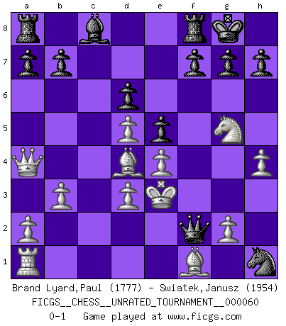 Last move : 0-1 2021 July 7 16:19:49 [Event "FICGS__CHESS__UNRATED_TOURNAMENT__000060"] [Site "FICGS"] [Date "2021.07.04"] [Round "1"] [White "Brand Lyard,Paul"] [Black "Swiatek,Janusz"] [Result "0-1"] [WhiteElo "1777"] [BlackElo "1954"] 1.c4 Nf6 2.Nc3 e5 3.e4 Bc5 4.Nf3 Ng4 5.h4 Nxf2 6.Qa4 Nxh1 7.d3 O-O 8.Nd5 Bf2+ 9.Ke2 d6 10.b3 Nc6 11.Ng5 Nd4+ 12.Kd2 c6 13.Bb2 cxd5 14.cxd5 Be3+ 15.Kxe3 Qf6 16.Bxd4 Qf2+ 0-1 English Opening Kingside Castling by player Black (move 7) Player Black won this chess game. Follow this game move after move (download)If you aren't afraid of Spassky, then I have removed the element of money. (Jim Slater) Im Reiche der Wirklichkeit ist man nie so glücklich wie im Reiche der Gedanken. (Arthur Schopenhauer) Ayuda a tus piezas para que ellas te puedan ayudar. (Paul Morphy) La vérité est comme le meilleur coup aux échecs : elle existe, mais il faut la chercher. (Arturo Perez-Reverte) All war is based on deception. (Sun Tzu)