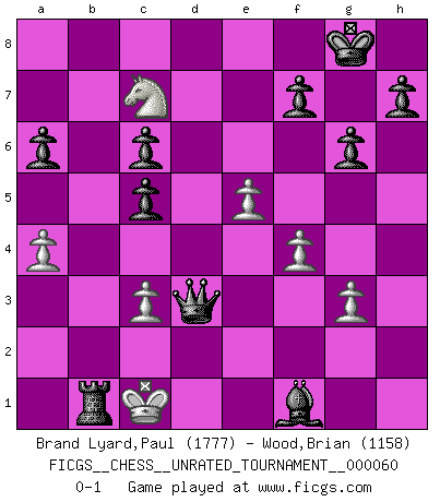 Last move : 0-1 2021 August 16 0:11:46 [Event "FICGS__CHESS__UNRATED_TOURNAMENT__000060"] [Site "FICGS"] [Date "2021.07.04"] [Round "1"] [White "Brand Lyard,Paul"] [Black "Wood,Brian"] [Result "0-1"] [WhiteElo "1777"] [BlackElo "1158"] 1.e4 c5 2.c4 e6 3.e5 d5 4.cxd5 exd5 5.f4 Nc6 6.Bb5 a6 7.Bxc6+ bxc6 8.Qh5 g6 9.Qg5 Be7 10.Qg3 Bh4 11.Qxh4 Qxh4+ 12.g3 Qd8 13.Ne2 d4 14.d3 Bh3 15.a4 Ne7 16.Na3 Qd5 17.Nc4 Qxh1+ 18.Kd2 O-O 19.Ra3 Qxh2 20.Nb6 Bf1 21.Kc2 Qxe2+ 22.Bd2 Nd5 23.Nxa8 Nb4+ 24.Kc1 Nxd3+ 25.Kc2 Nb4+ 26.Kc1 Qc4+ 27.Bc3 dxc3 28.Rxc3 Na2+ 29.Kc2 Nxc3 30.bxc3 Rb8 31.Nc7 Qd3+ 32.Kc1 Rb1+ 0-1 Sicilian defense Kingside Castling by player Black (move 18) Player Black won this chess game. Follow this game move after move (download)When asked, -How is that you pick better moves than your opponents?, I responded: I'm very glad you asked me that, because, as it happens, there is a very simple answer. I think up my own moves, and I make my opponent think up his. (Alexander Alekhine) Ich trinke, ich rauche, ich spiele, ich liebe Frauen aber Fernschach ist ein Laster, das ich nicht habe. (Mikhail Nekhemyevich Tal) Si un gobernante no entiende al Ajedrez, ¿como puede governar él un reinado?. (El Rey Khusros II) Il vaut mieux sacrifier les pièces de l'adversaire. (Xavier Tartacover) Begin at the beginning and go on till you come to the end; then stop. (Lewis Carrol, Alice in Wonderland)