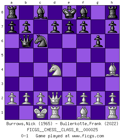Last move : 0-1 2007 August 31 0:19:36 [Event "FICGS__CHESS__CLASS_B__000025"] [Site "FICGS"] [Date "2007.07.13"] [Round "1"] [White "Burrows,Nick"] [Black "Bullerkotte,Frank"] [Result "0-1"] [WhiteElo "1965"] [BlackElo "2022"] 1.d4 Nf6 2.Bg5 Ne4 3.Bh4 c5 4.Nd2 Nxd2 5.Qxd2 Qb6 6.O-O-O cxd4 7.Nf3 Nc6 8.Nxd4 g6 0-1 This chess game has been lost on time (started : 2007.07.13 22:44:18) Trompowsky attack (Ruth, Opovcensky Opening) Queenside Castling by player White (move 6) Player Black won this chess game. Follow this game move after move (download)Chess is a more highly symbolic game, but the aggressions are therefore even more frankly represented in the play. It probably began as a war game; that is, the representation of a miniature battle between the forces of two kingdoms. (Karl Meninger) Frage: Was machen Sie mit den Preisen? Anwort: Ich habe Angst, dass meine Freundin davon neue Kleider kauft. (Loek van Wely) Puntos débiles o agujeros en la posición de tu oponente deben de ser ocupados por piezas, no Peones. (Siegbert Tarrasch) Je fais ceci parce que dans cinquante coups j'obtiendrai cela; je m'appelle Mikhail Moisevitch Botvinnik. (Botvinnik) Whoever said the pen is mightier than the sword obviously never encountered automatic weapons. (US General Douglas MacArthur)
