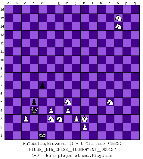 Last move : 1-0 2022 July 22 4:46:48 [Event "FICGS__BIG_CHESS__TOURNAMENT__000127"] [Site "FICGS"] [Date "2021.07.04"] [Round "1"] [White "Autobello,Giovanni"] [Black "Ortiz,Jose"] [Result "1-0"] [WhiteElo ""] [BlackElo "1623"] 1.g2-g4 n15-n14 2.f2-f4 o15-o13 3.h1-c6 c15-c14 4.h3-h4 p16-o14 5.f1-p10 m15-m13 6.o2-o4 l16-m15 7.c6-c11 d15-d13 8.n2-n4 b16-d15 9.o1-e10 e15-e13 10.b2-b3 f15-f13 11.c1-b2 o16-m14 12.p1-o3 g16-f14 13.m2-m3 a15-a13 14.l1-n3 f16-b12 15.c11-f11 g15-g14 16.n3-e11 h16-g15 17.e1-f1 e13-e12 18.f11-k11 j15-k13 19.p10-n8 h14-h13 20.f1-f3 c14-c13 21.f3-d3 k13-h12 22.k11-k8 d13-d12 23.e11-f10 m15-e8 24.f10-h12 j14-j13 25.h12-f14 d15-f14 26.d3-d8 e8-l2 27.m1-l1 l2-m3 28.l1-l3 d12-d11 29.e10-h13 m3-n4 30.l3-k3 f14-h13 31.k8-k15 j16-h16 32.b2-m12 h15-k14 33.k15-g15 h16-g15 34.q1-l1 n14-n13 35.m12-l11 k14-l12 36.d8-g8 k16-l14 37.n8-h13 e16-h16 38.h13-g14 c16-e14 39.g14-f13 g15-f14 40.f13-e14 f14-e14 41.g8-g14 e14-f13 42.g14-l14 h16-h11 43.l1-l7 n4-f11 44.k3-k13 m16-j16 45.l7-j7 a16-g16 46.l11-j13 l12-j13 47.j7-j13 h11-h13 48.j13-h13 f11-h13 49.k13-h13 g16-g13 50.h13-h14 b12-c11 51.a2-a4 c11-g7 52.b1-c3 q16-k16 53.h14-f14 f13-e13 54.f14-e14 e13-d12 55.e14-d14 g13-d13 56.d14-g14 j16-g16 57.g14-b14 d13-d15 58.a4-a5 k16-k14 59.l14-k14 l15-k14 60.b14-k14 m14-b4 61.a1-a4 b4-l13 62.k14-k13 l13-m12 63.a4-c4 o14-n12 64.c4-c13 b15-b14 65.c13-c14 n12-m14 66.c14-m14 p15-p14 67.m14-m13 g16-g14 68.c3-e4 d15-d14 69.k1-l3 g7-b12 70.g1-h3 p14-p13 71.h2-j4 g14-g4 72.e2-e3 g4-g14 73.l3-k5 q15-q13 74.k13-g13 p13-p12 75.g13-g14 d14-g14 76.j2-k4 g14-k14 77.k5-h6 k14-k8 78.h3-j5 k8-n8 79.o3-n5 n8-m8 80.j5-k3 o13-o12 81.m13-m14 b12-c13 82.m14-q14 m8-q8 83.q2-q3 q13-q12 84.n5-p6 q8-q10 85.b3-b4 q12-q11 86.k3-j5 q10-p10 87.o4-o5 p10-o10 88.p2-p4 o10-m10 89.j1-j2 m10-m1 90.c2-c3 m1-e1 91.j2-k3 e1-n1 92.j4-l3 m12-g7 93.h6-k7 n13-n12 94.q14-q12 n1-n3 95.q3-q4 p12-p11 96.q12-o12 n12-n11 97.j5-l4 n3-n10 98.o12-o11 q11-q10 99.o11-p11 n10-n9 100.p11-q11 n9-k9 101.k7-m8 k9-k10 102.q11-n11 g7-h6 103.n11-n10 k10-n10 104.m8-n10 h6-j7 105.e4-g5 j7-m4 106.q4-q5 b14-b13 107.q5-q6 q10-q9 108.q6-q7 q9-q8 109.l4-m6 d12-c11 110.m6-o7 b13-b12 111.o7-q8 a13-a12 112.q8-o7 m4-p7 113.q7-q8 e12-e11 114.q8-q9 p7-m10 115.q9-q10 b12-b11 116.q10-q11 a12-a11 117.q11-q12 e11-e10 118.q12-q13 c13-g9 119.n10-p11 b11-b10 120.p11-o13 m10-l11 121.q13-q14 g9-h8 122.q14-q15 d11-d10 123.o13-q14 a11-a10 124.q14-o15 b10-b9 125.o7-m8 l11-k10 126.m8-n10 c11-c10 127.n10-o12 e10-e9 128.o12-p14 d10-d9 129.q15-q16 k10-q16 130.p14-q16 d9-d8 131.l3-j4 a10-a9 132.k4-h5 h8-b14 133.o5-o6 c10-c9 134.o6-o7 b9-b8 135.o7-o8 b14-d16 136.o8-o9 d16-l9 137.o9-o10 a9-a8 138.o10-o11 e9-e8 139.q16-p14 c9-c8 140.o11-o12 d8-d7 141.o12-o13 b8-b7 142.p14-n13 l9-k10 143.o13-o14 d7-d6 144.n13-m15 k10-o14 145.m15-o14 c8-d7 146.p4-p5 a8-a7 147.p6-n5 e8-e7 148.p5-p6 d6-d5 149.p6-p7 d7-c6 150.p7-p8 b7-b6 151.p8-p9 b6-a5 152.b4-a5 a7-a6 153.p9-p10 c6-b5 154.p10-p11 b5-a5 155.p11-p12 a5-b5 156.p12-p13 a6-a5 157.p13-p14 b5-c4 158.p14-p15 a5-a4 159.p15-p16 c4-d3 160.p16-a16 d3-d2 161.a16-a4 d2-e3 162.a4-d4 e3-e2 163.j4-g3 e2-e1 164.g5-f3 1-0 Follow this game move after move (download)Chess is a terrific way for kids to build self image and self esteem. (Saudin Robovic) Mein Name ist Rustam Kamsky. Sie haben meinen Sohn belästigt. Bereiten Sie sich aufs Sterben vor. (Rustam Kamsky) Aquel que toma al Peón de Caballo de la Reina, se pasará la noche a dormir en la calle. (Anónimo) D'abord les bases : Jouez et étudiez, puis étudiez et jouez, ensuite jouez et étudiez, puis étudiez et jouez. Deuxièmement : Donnez toujours le meilleur de vous-même ! (Ken Smith) The problem with troubleshooting is that trouble shoots back. (Anonymous)