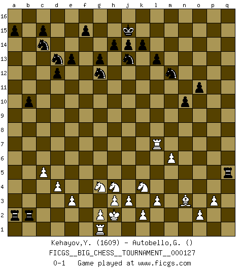 Last move : 0-1 2022 February 28 7:36:29 [Event "FICGS__BIG_CHESS__TOURNAMENT__000127"] [Site "FICGS"] [Date "2021.07.04"] [Round "1"] [White "Kehayov,Yulian"] [Black "Autobello,Giovanni"] [Result "0-1"] [WhiteElo "1609"] [BlackElo ""] 1.j2-k4 g15-g13 2.h1-o7 j15-g14 3.o7-o15 p16-o14 4.o15-c4 b16-c14 5.m2-m4 h16-o10 6.p1-o3 o10-f2 7.j1-h1 f2-e1 8.d2-d4 e1-c1 9.c4-d3 c1-b2 10.d3-c3 b2-c3 11.b1-c3 n15-n14 12.n2-n4 o16-b4 13.c3-d5 b4-d2 14.e2-e3 d2-a5 15.c2-c3 d15-d13 16.c3-c4 c16-n6 17.m4-m5 n6-q9 18.o1-k5 q16-o16 19.a1-b1 a16-b16 20.f1-d3 e15-e13 21.l1-n3 f16-a11 22.h1-j2 e16-e14 23.h2-g4 e14-f14 24.g1-f3 m15-m13 25.b1-b3 o14-n12 26.b3-a3 a5-d8 27.k1-h2 m16-m14 28.m1-m4 m14-k14 29.k5-h7 l16-m15 30.l2-l3 m15-d7 31.a3-a7 d7-g4 32.h2-g4 b15-b13 33.m4-l4 l15-l13 34.a2-a4 b13-b12 35.d5-c7 b12-b11 36.c7-b9 a11-c9 37.a7-d7 b16-b12 38.b9-d8 c9-d8 39.d7-d8 b12-h12 40.l4-l7 d13-d12 41.d8-c8 g16-e15 42.l7-q7 o16-o9 43.h7-n12 m13-n12 44.c8-q8 f14-f9 45.d3-h7 f9-h9 46.h7-j6 q15-q14 47.q1-m1 q9-o11 48.j6-o11 n12-o11 49.a4-a5 k14-k5 50.q8-p8 o9-p9 51.p8-b8 k5-a5 52.b8-b2 h9-b9 53.b2-b9 p9-b9 54.m1-e1 b9-b2 55.e1-g1 a5-a2 56.f3-h4 k16-l14 57.q7-p7 p15-p13 58.p7-o7 p13-p12 59.o7-q7 h12-n12 60.q7-q14 n12-n4 61.q2-q3 n14-n13 62.q14-p14 n4-n12 63.j2-h2 j16-j15 64.o3-n5 n12-n5 65.p14-p12 g14-j13 66.p12-p11 n13-n12 67.q3-q4 e15-g14 68.q4-q5 n5-q5 69.p11-p12 n12-n11 70.p2-p3 l14-m12 71.p12-p7 n11-n10 72.p7-c7 g14-e15 73.c7-c13 h15-f14 74.c13-c7 b11-b10 75.c7-l7 k15-k14 76.c4-c5 e15-d13 77.m5-m6 f14-g12 0-1 This big chess game has been lost on time (started : 2021.07.04 3:5:52) Follow this game move after move (download)The sign of a great Master is his ability to win a won game quickly and painlessly. (Irving Chernev) Eine Person mit durchschnittlichem IQ kann etwa eine ELO von 2000 erreichen. (Jonathan Levitt) Por tratar de evitar la pérdida de una pieza, muchas personas han perdido una partida de Ajedrez. (Savielly Tartakover) Pour moi, les échecs ne sont pas un jeu mais un art. (Alexandre Alekhine) The difference between perseverance and obstinacy is that one comes from a strong will, and the other from a strong won't. (Henry Ward Beecher)