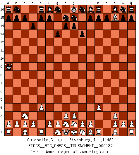 Last move : 1-0 2021 September 8 0:17:52 [Event "FICGS__BIG_CHESS__TOURNAMENT__000127"] [Site "FICGS"] [Date "2021.07.04"] [Round "1"] [White "Autobello,Giovanni"] [Black "Rivenburg,John"] [Result "1-0"] [WhiteElo ""] [BlackElo "1148"] 1.p1-o3 g15-g13 2.b1-c3 k15-k13 3.e2-e4 h16-a9 4.f1-c4 d15-d14 5.c4-o15 c16-p4 6.m2-m4 p4-o3 7.n2-o3 1-0 This big chess game has been lost on time (started : 2021.07.04 3:5:52) Follow this game move after move (download)In Chess, at least, the brave inherit the earth. (Edmar Mednis) Ein Kibitz ist einer, der deinem Gegner gute Ratschläge gibt. (Andrew Soltis) Aquellos que dicen entender al Ajedrez, no entienden nada. (Robert Hubner) Les sacrifices démontrent seulement que quelqu'un a gaffé. (Savielly Tartacover) The project of the man are lower than those of the sky. (Chinese proverb)