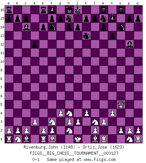 Last move : 0-1 2021 September 15 1:28:49 [Event "FICGS__BIG_CHESS__TOURNAMENT__000127"] [Site "FICGS"] [Date "2021.07.04"] [Round "1"] [White "Rivenburg,John"] [Black "Ortiz,Jose"] [Result "0-1"] [WhiteElo "1148"] [BlackElo "1623"] 1.k2-k4 b16-c14 2.g2-g4 d15-d13 3.h1-d5 e15-e14 4.d5-o15 m15-m14 5.o15-o3 p16-o14 6.n2-n3 l16-p12 7.k1-l3 n15-n13 8.j2-h4 j15-k13 9.g1-f3 k16-m15 10.o1-b13 c16-d15 11.b13-c14 d15-c14 12.m2-m3 g16-f14 13.d2-d3 d13-d12 14.n3-n4 o16-n15 15.o3-o5 q16-o16 0-1 This big chess game has been lost on time (started : 2021.07.04 3:5:52) Follow this game move after move (download)The hallmark of the artist is simplicity. (Larry Evans) Den Ruhm habe ich schon, jetzt brauche ich noch das Geld. (Wilhelm Steinitz) Hasta este punto, las blancas han seguido un análisis bien conocido. Pero ahora el hace un error fatal: empieza a usar su propia cabeza. (Siegbert Tarrasch) La vérité est comme le meilleur coup aux échecs : elle existe, mais il faut la chercher. (Arturo Perez-Reverte) Opportunities multiply as they are seized. (Sun Tzu)