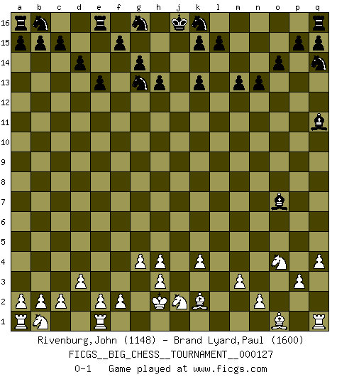 Last move : 0-1 2021 September 21 12:8:27 [Event "FICGS__BIG_CHESS__TOURNAMENT__000127"] [Site "FICGS"] [Date "2021.07.04"] [Round "1"] [White "Rivenburg,John"] [Black "Brand Lyard,Paul"] [Result "0-1"] [WhiteElo "1148"] [BlackElo "1600"] 1.k2-k4 h15-g13 2.g2-g4 j15-k13 3.j2-h4 h16-o10 4.h1-l4 o10-o2 5.k1-l3 d15-d14 6.l4-m3 c16-o5 7.m3-o3 o2-o3 8.p1-o3 o5-l2 9.m1-n1 n15-n14 10.f1-g2 o16-d6 11.g2-d5 d6-h2 12.j1-h2 m15-m13 13.o3-m4 l2-p6 14.d2-d3 m16-m14 15.c1-o12 m14-l14 16.o12-n13 o15-o14 17.n13-k10 g13-j12 18.k10-o6 h14-h13 19.o6-g13 j12-g13 20.m2-m3 l14-l3 21.l1-k2 l3-l9 22.d5-c6 n14-n13 23.c6-k13 j14-k13 24.n1-l1 l9-l1 25.k2-l1 g15-g14 26.p2-p3 f16-p7 27.m4-n6 p7-n9 28.g1-j2 l16-q11 29.q2-q4 p16-q14 30.n6-o4 p6-o7 31.l1-k2 n9-h4 32.j3-h4 e15-e13 0-1 This big chess game has been lost on time (started : 2021.07.04 3:5:52) Follow this game move after move (download)Help your pieces so they can help you. (Paul Morphy) Im Blitz ist es einfacher mit einer Figur weniger anzugreifen, als sich mit einer Mehrfigur zu verteidigen. (Mikhail Nekhemyevich Tal) Aquel que ve no otra dirección en el juego que la de dar Jaque Mate a su oponente, nunca será un buen jugador de Ajedrez. (Euwe) Il n'y a pas eu de défaite parce que je ne crois pas que cet ordinateur ait jamais existé. IBM a triché en refusant d'imprimer les modes de recherche de la machine. C'est évident, pendant le match, des coups décisifs ont été joués par des êtres humains. Aujourd'hui, les meilleurs spécialistes en informatique ne peuvent toujours pas expliquer comment Deep-Blue a pu jouer contre la logique des ordinateurs. IBM a gagné une guerre de communication, mais ils sont incapables de prouver que l'ordinateur a gagné tout seul. (Garry Kasparov) Life is pleasant. Death is peaceful. It's the transition that's troublesome. (Isaac Asimov)