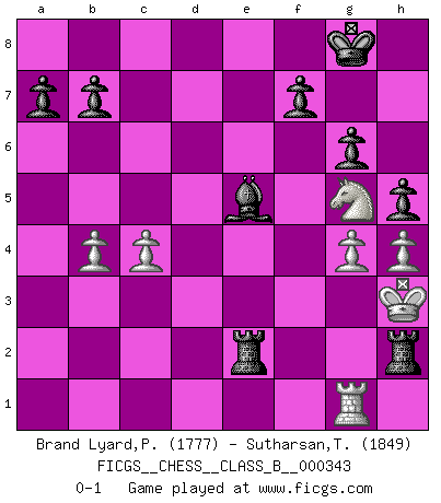 Last move : 0-1 2021 August 17 15:42:50 [Event "FICGS__CHESS__CLASS_B__000343"] [Site "FICGS"] [Date "2021.07.04"] [Round "1"] [White "Brand Lyard,Paul"] [Black "Sutharsan,Thirunathan"] [Result "0-1"] [WhiteElo "1777"] [BlackElo "1849"] 1.e4 c5 2.c4 Nc6 3.Nc3 g6 4.Nd5 Bg7 5.d3 e6 6.Ne3 Nge7 7.Nf3 O-O 8.h4 d5 9.exd5 exd5 10.cxd5 Nxd5 11.Nxd5 Qxd5 12.Ng5 Bf5 13.Rb1 Qxa2 14.Be3 Nd4 15.Bxd4 Bxd4 16.Qc2 Rfe8+ 17.Be2 c4 18.Qxc4 Qxc4 19.dxc4 Bxb1 20.O-O Rxe2 21.Rxb1 Rxf2 22.Kh2 Re8 23.b4 R8e2 24.Rg1 Be5+ 25.Kh3 h5 26.g4 Rh2+ 0-1 Sicilian defense Kingside Castling by player Black (move 7) Kingside Castling by player White (move 20) Player Black won this chess game. Follow this game move after move (download)Chess is really ninety nine percent calculation. (Soltis) Gott hat gewollt, dass ich Champion werde. (Surab Azmajparaschvili) Una buena ofensiva y una buena defensa, comienzan ambas con un buen desarrollo. (Bruce A. Moon) La solitude du joueur d'Echecs à l'approche du mat est semblable à celle du condamné. (Francis Szpiner) Experiences are the keys to life. (Daniel Parmet)