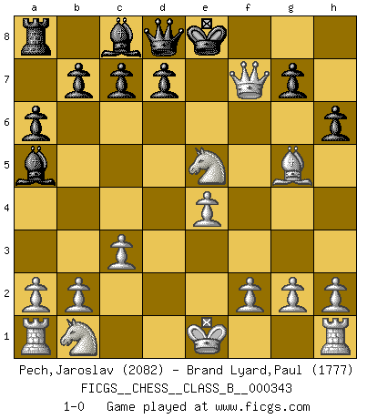 Last move : 1-0 2021 July 31 16:12:8 [Event "FICGS__CHESS__CLASS_B__000343"] [Site "FICGS"] [Date "2021.07.04"] [Round "1"] [White "Pech,Jaroslav"] [Black "Brand Lyard,Paul"] [Result "1-0"] [WhiteElo "2082"] [BlackElo "1777"] 1.e4 e5 2.Nf3 Nc6 3.Bb5 f6 4.d4 a6 5.Bc4 Bb4+ 6.c3 Ba5 7.dxe5 fxe5 8.Bxg8 Rxg8 9.Bg5 Ne7 10.Nxe5 h6 11.Qf3 Rf8 12.Qh5+ Ng6 13.Qxg6+ Rf7 14.Qxf7+ 1-0 Ruy Lopez : Nuernberg variation Player White won this chess game. Follow this game move after move (download)I love all positions. Give me a difficult positional game, I will play it. But totally won positions, I cannot stand them. (Hein Donner) Es macht mich traurig, wenn ich sehe, dass Golfprofis mehr verdienen als Schachsportler. Obwohl ich davon überzeugt bin, dass wir Schachspieler viel härter trainieren müssen als die Golfer. (Alexandra Kosteniuk) Un mal día en el Ajedrez, es mejor que cualquier buen día en el trabajo. (Anonymous) Le temps de noter son nom sur la feuille de partie, j'étais déjà en zeitnot ! D'un modeste amateur apparié lors de la première ronde d'un open contre le grand-maître Azmaïparashvili. Political correctness is subjecting us to gross incompetence. (Johann Piek)
