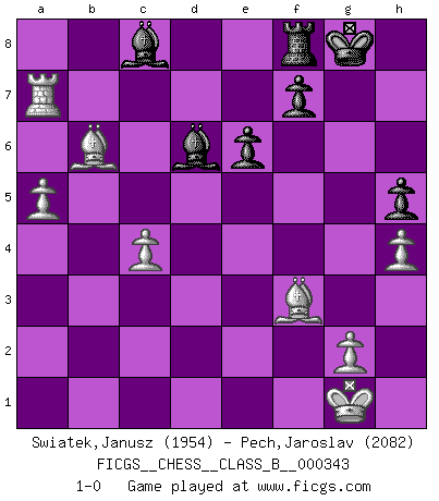 Last move : 1-0 2022 March 24 12:59:20 [Event "FICGS__CHESS__CLASS_B__000343"] [Site "FICGS"] [Date "2021.07.04"] [Round "1"] [White "Swiatek,Janusz"] [Black "Pech,Jaroslav"] [Result "1-0"] [WhiteElo "1954"] [BlackElo "2082"] 1.e4 c5 2.Nf3 Nc6 3.d4 cxd4 4.Nxd4 Nf6 5.Nc3 g6 6.Nxc6 bxc6 7.e5 Ng8 8.Qf3 Qa5 9.Bf4 g5 10.Bg3 e6 11.Bd3 h5 12.h4 g4 13.Qe3 Ne7 14.O-O Nd5 15.Qe2 Nxc3 16.bxc3 Qxc3 17.Rab1 Bc5 18.Rb3 Qa5 19.Rfb1 Be7 20.Qe3 Qd8 21.Rb8 Rxb8 22.Rxb8 Qc7 23.Ra8 Qb7 24.Rxa7 Qb8 25.Ra4 Bd8 26.c4 Qb2 27.a3 Be7 28.Kh2 Qb3 29.Ra8 Qb7 30.Ra7 Qb3 31.Ra8 Qb7 32.Ra5 Qc7 33.Ra7 Qb8 34.Be4 Bd8 35.Ra4 Be7 36.f4 gxf3 37.Bxf3 Bf8 38.Ra7 Be7 39.a4 Bf8 40.a5 Qb4 41.Ra8 Qb7 42.Ra7 Qb4 43.Be1 Qc5 44.Bf2 Qxe3 45.Bxe3 d5 46.exd6 Bxd6+ 47.Kg1 O-O 48.Bxc6 Rd8 49.Bb6 Rf8 50.Bf3 1-0 Sicilian defense Kingside Castling by player White (move 14) Kingside Castling by player Black (move 47) Player White won this chess game. Follow this game move after move (download)The tactician knows what to do when there is something to do; whereas the strategian knows what to do when there is nothing to do. (Gerald Abrahams) Mit Schach schule ich mein Gefühl für Geometrie, was für Tennis und Schach gleichermaßen wichtig ist. (Boris Becker) Combinaciones deslumbrantes son para la mayoría, mover madera es para los pocos. (Georg Kieninger) Toutes choses étant égales, c'est la conviction qui gagne. Alliée à une volonté de vaincre, elle sert de détonateur, suscite des idées, disperse les doutes et aide à penser clairement. (Robert Fischer) There will be no order, only chaos. (Sol Robeson in Pi by Darren Aronofsky)
