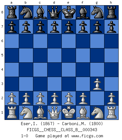 Last move : 1-0 2021 August 14 4:56:8 [Event "FICGS__CHESS__CLASS_B__000343"] [Site "FICGS"] [Date "2021.07.04"] [Round "1"] [White "Eser,Ipekyilmaz"] [Black "Carboni,Marcello"] [Result "1-0"] [WhiteElo "1867"] [BlackElo "1800"] 1.g3 1-0 This chess game has been lost on time (started : 2021.07.04 22:14:23) Benko's Opening Player White won this chess game. Follow this game move after move (download)Chess holds its master in its own bonds, shackling the mind and brain so that the inner freedom of the very strongest must suffer. (Albert Einstein) Rubinstein ist ein Turmendspiel, welches die Götter vor tausenden von Jahren begannen. (Savielly Grigorievitsch Tartakower) Yo creo que el Ajedrez posee una magia que es también una ayuda en la edad avanzada. Una rodilla reumática es olvidada durante una partida de Ajedrez y otros eventos pueden parecer algo sin importancia comparada a una catástrofe en el tablero de Ajedrez. (Vlastimil Hort) A ce moment-là, je menaçais de comprendre la position ! (Clément L'Heureux) Just because you do not take an interest in politics doesn't mean politics won't take an interest in you. (Pericles 430 B.C.)