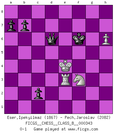 Last move : 0-1 2022 October 4 23:12:14 [Event "FICGS__CHESS__CLASS_B__000343"] [Site "FICGS"] [Date "2021.07.04"] [Round "1"] [White "Eser,Ipekyilmaz"] [Black "Pech,Jaroslav"] [Result "0-1"] [WhiteElo "1867"] [BlackElo "2082"] 1.g3 d5 2.Bg2 c5 3.d3 e5 4.Kf1 Nc6 5.h3 f5 6.h4 Be7 7.Nh3 Nf6 8.Bg5 Be6 9.Nd2 Qd7 10.e3 O-O-O 11.Qe2 Rhg8 12.Re1 h6 13.Bxf6 gxf6 14.Kg1 d4 15.Kh2 dxe3 16.fxe3 Rg7 17.Rhg1 Bd6 18.Bxc6 Qxc6 19.Qh5 Rdg8 20.e4 fxe4 21.dxe4 c4 22.Qf3 Bb4 23.c3 Bc5 24.Nf2 Qb6 25.Rg2 Bxf2 26.Rxf2 Rxg3 27.Qxg3 Rxg3 28.Kxg3 Qxb2 29.Re3 Qxa2 30.Ref3 Kd7 31.Rxf6 Qc2 32.Rxh6 Qd3+ 33.Nf3 Qxe4 34.Rd2+ Bd5 35.Rf6 Ke7 36.Rxd5 Qxd5 37.Rf5 Qd3 38.Rxe5+ Kf6 39.h5 Qxc3 40.h6 Qd3 41.Kf4 c3 42.Re3 Qd6+ 43.Ke4 c2 0-1 This chess game has been lost on time (started : 2021.07.04 22:14:23) Benko's Opening Queenside Castling by player Black (move 10) 10 pieces endgame at move 38 : White KRNPP , Black KQPPP WHITE : King + 1 Rook 1 Knight 2 Pawns BLACK : King + 1 Queen 3 Pawns 9 pieces endgame at move 39 : White KRNP , Black KQPPP WHITE : King + 1 Rook 1 Knight 1 Pawn BLACK : King + 1 Queen 3 Pawns Player Black won this chess game. Follow this game move after move (download)Life is like a game of Chess, changing with each move. (Chinese proverb) Schach ist ein Reich, wo sich die menschliche Phantasie frei entfalten kann. (David Bronstein) No todos los artistas son jugadores de Ajedrez, pero todos los jugadores de Ajedrez son artistas. (Marcel Duchamp) Aux échecs, l'amour-propre est satisfait quand on remporte la victoire, mais il n'y a pas de honte à être battu. (Benjamin Franklin) All the troubles of the world come from being unable to sit alone in a quiet room. (Blaise Pascal)