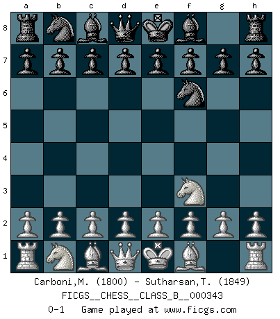 Last move : 0-1 2021 August 14 18:40:37 [Event "FICGS__CHESS__CLASS_B__000343"] [Site "FICGS"] [Date "2021.07.04"] [Round "1"] [White "Carboni,Marcello"] [Black "Sutharsan,Thirunathan"] [Result "0-1"] [WhiteElo "1800"] [BlackElo "1849"] 1.Nf3 Nf6 0-1 This chess game has been lost on time (started : 2021.07.04 22:14:23) Reti Opening Player Black won this chess game. Follow this game move after move (download)There just isn't enough televised Chess. (David Letterman) Ein Schachgenie ist jemand der verdammt gut Schach spielt. (Jonathan Levitt) Siempre es mejor sacrificar los hombres de tu oponente. (Savielly Tartakower) Les écrivains ont utilisé les échecs pour analyser les côtés extrêmes de la nature humaine. Dans ce cadre, les échecs offrent un champ d'expérimentation idéal. Mais on pourrait faire la même chose avec la peinture. Et là, en vous référant à Van Gogh, vous ne tirerez pas de conclusion définitive sur les peintres. (Gary Kasparov) How many people work in NATO Headquarters ? - About half of them. (Dirk Stikker, NATO general secretary)