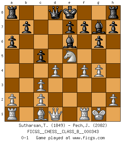 Last move : 0-1 2021 December 9 11:38:6 [Event "FICGS__CHESS__CLASS_B__000343"] [Site "FICGS"] [Date "2021.07.04"] [Round "1"] [White "Sutharsan,Thirunathan"] [Black "Pech,Jaroslav"] [Result "0-1"] [WhiteElo "1849"] [BlackElo "2082"] 1.e4 c5 2.Nc3 Nc6 3.f4 g6 4.Nf3 Bg7 5.Bb5 Nd4 6.O-O Nxb5 7.Nxb5 d5 8.exd5 a6 9.Nc3 Nf6 10.d4 Nxd5 11.Ne5 Bf5 12.g4 Nxc3 13.bxc3 Be6 0-1 This chess game has been lost on time (started : 2021.07.04 22:14:23) Sicilian : Grand Prix attack Kingside Castling by player White (move 6) Player Black won this chess game. Follow this game move after move (download)A good sacrifice is one that is not necessarily sound but leaves your opponent dazed and confused. (Rudolph Spielmann) Bis jetzt ist Weiß einer wohlbekannten Analyse gefolgt. Aber jetzt begeht er einen schrecklichen Fehler: Er beginnt seinen eigenen Kopf zu benutzen. (Siegbert Tarrasch) Un mal día en el Ajedrez, es mejor que cualquier buen día en el trabajo. (Anonymous) L'attaque fait le spectacle, la défense gagne les matchs. (Dicton footballistique) Luck never gives; it only lends. (Swedish proverb)