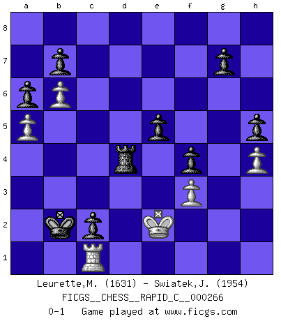 Last move : 0-1 2021 July 15 19:56:31 [Event "FICGS__CHESS__RAPID_C__000266"] [Site "FICGS"] [Date "2021.07.05"] [Round "1"] [White "Leurette,Marc-Antoine"] [Black "Swiatek,Janusz"] [Result "0-1"] [WhiteElo "1631"] [BlackElo "1954"] 1.e4 e6 2.d4 d5 3.e5 c5 4.Bb5+ Nc6 5.Nf3 cxd4 6.Nxd4 Bd7 7.Nxc6 Bxc6 8.Bd3 d4 9.O-O Qd5 10.f3 Qxe5 11.Qe1 Qxe1 12.Rxe1 Nf6 13.Bg5 Nd5 14.Nd2 h6 15.Bh4 Bb4 16.Rad1 Ne3 17.Ra1 Bxd2 18.Reb1 Rc8 19.Be1 Bxe1 20.Rxe1 Ke7 21.b3 Bxf3 22.gxf3 Nxc2 23.Bxc2 Rxc2 24.Red1 Rd8 25.b4 e5 26.a4 f5 27.b5 d3 28.a5 Rd4 29.Rac1 Rdc4 30.Rxc2 dxc2 31.Rc1 Kd6 32.Kf2 Kc5 33.b6 a6 34.Ke2 Kb4 35.Kd2 Kb3 36.h4 Rd4+ 37.Ke2 h5 38.Ke1 f4 39.Ke2 Kb2 0-1 French : Advance variation Kingside Castling by player White (move 9) Player Black won this chess game. Follow this game move after move (download)The passion for playing Chess is one of the most unaccountable in the world. (H.G. Wells) Nie in meinem Leben habe ich die französische Verteidigung gespielt, welche die Stumpfsinnigste von allen ist. (Wilhelm Steinitz) Observen a Garry Kasparov. Después de una derrota, invariablemente el gana la próxima partida. Prácticamente hace pedazos a su siguiente oponente. Eso es algo que tenemos que aprender a lograr. (Maurice Ashley) Ne tendez aucun piège pour le plaisir ! Ne jouez rien dans l'espoir que l'adversaire réagisse de façon stupide ! Prenez toujours pour acquis que l'adversaire va trouver le meilleur coup ! Ne jouez jamais de coup dans l'espoir que l'adversaire ne voie pas la menace ! Chacun de vos coups doit améliorer la position d'une façon ou d'une autre. Programmer - an organism that turns coffee into software. (Anonymous)