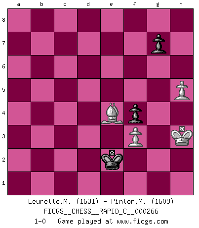 Last move : 1-0 2021 July 19 12:51:27 [Event "FICGS__CHESS__RAPID_C__000266"] [Site "FICGS"] [Date "2021.07.05"] [Round "1"] [White "Leurette,Marc-Antoine"] [Black "Pintor,Manuel"] [Result "1-0"] [WhiteElo "1631"] [BlackElo "1609"] 1.e4 e5 2.Nf3 Nc6 3.Bc4 Bc5 4.c3 Qf6 5.d4 exd4 6.e5 Nxe5 7.Qe2 d6 8.cxd4 Bb4+ 9.Bd2 Bxd2+ 10.Nbxd2 Bg4 11.dxe5 dxe5 12.Qxe5+ Qxe5+ 13.Nxe5 Bh5 14.O-O Nf6 15.Rae1 O-O 16.b3 Rad8 17.Ne4 Nxe4 18.Rxe4 c6 19.f3 Rd6 20.g4 Bg6 21.Nxg6 hxg6 22.h4 b5 23.Be2 Rd2 24.a4 a6 25.axb5 axb5 26.Kf2 Ra8 27.b4 R8a2 28.Rc1 Rac2 29.Rxc2 Rxc2 30.Re8+ Kh7 31.Ke3 Rb2 32.Rc8 Rc2 33.Rc7 Kg8 34.Bd3 Rc3 35.Kd4 Rc1 36.Be4 Rc4+ 37.Kd3 Rxb4 38.Rxc6 Kf8 39.Rb6 Ke7 40.Bc6 Kd6 41.Rxb5 Rxb5 42.Bxb5 Ke5 43.Bc6 f5 44.gxf5 gxf5 45.Ke3 f4+ 46.Kf2 Kd4 47.Be4 Kc3 48.h5 Kd2 49.Kg2 Ke2 50.Kh3 1-0 Giuoco Piano Kingside Castling by player White (move 14) Kingside Castling by player Black (move 15) 10 pieces endgame at move 41 : White KBPPP , Black KRPPP WHITE : King + 1 Bishop 3 Pawns BLACK : King + 1 Rook 3 Pawns 9 pieces endgame at move 42 : White KBPPP , Black KPPP WHITE : King + 1 Bishop 3 Pawns BLACK : King + 3 Pawns 8 pieces endgame at move 44 : White KBPPP , Black KPP WHITE : King + 1 Bishop 3 Pawns BLACK : King + 2 Pawns 7 pieces endgame at move 44 : White KBPP , Black KPP WHITE : King + 1 Bishop 2 Pawns BLACK : King + 2 Pawns Player White won this chess game. Follow this game move after move (download)Chess is a terrible game. If you have no center, your opponent has a freer position. If you do have a center, then you really have something to worry about ! (Siegbert Tarrasch) Alle offensichtlichen Züge sehen nach dem Spiel in der Analyse verdächtig aus. (Viktor Kortschnoi) Un mal plan es mejor que no tener ningún plan. (Frank Marshall) Les échecs c'est le défi de l'alpiniste, toujours plus haut, prêt à tout pour monter à l'assaut du Roi ennemi. Les échecs, c'est de la musique en mouvement, un ballet majestueux pour les yeux. C'est de la poésie composée par les fantômes du passé qui au même titre que Rimbaud ou Verlaine méritent notre admiration. Les échecs, c'est de la peinture ou le moindre mouvement modifie le tableau pour en faire un Picasso ou un Van Gogh. Les échecs, c'est tout et rien, c'est la vie et la mort. Jjulie33 sur le forum de France-Echecs. Hello Thibault, if I have had a plan (and I had one, I hope), I have forgotten it during the last week... - Hello Heinz-Georg. What do you mean a plan ? (Anonymous players, during a Big Chess game)