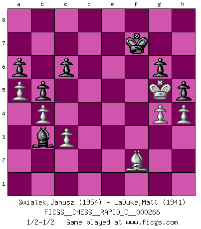 Last move : 1/2-1/2 2021 August 14 21:32:44 [Event "FICGS__CHESS__RAPID_C__000266"] [Site "FICGS"] [Date "2021.07.05"] [Round "1"] [White "Swiatek,Janusz"] [Black "LaDuke,Matt"] [Result "1/2-1/2"] [WhiteElo "1954"] [BlackElo "1941"] 1.e4 e5 2.Nf3 Nc6 3.Bb5 a6 4.Ba4 Nf6 5.O-O Bc5 6.c3 b5 7.Bc2 d5 8.d4 dxe4 9.Nxe5 Nxe5 10.dxc5 Qe7 11.Nd2 Bf5 12.Qe2 O-O 13.Nxe4 Nxe4 14.Bxe4 Nd7 15.c6 Qxe4 16.Qxe4 Bxe4 17.cxd7 c6 18.Bf4 Rfd8 19.a4 Bf5 20.Rfd1 Rxd7 21.Rxd7 Bxd7 22.Rd1 Be6 23.a5 Bd5 24.Re1 Be6 25.f3 Re8 26.h4 f6 27.Kf2 h5 28.Re4 Kf7 29.Be3 Rd8 30.b4 Rd3 31.Rd4 Rxd4 32.Bxd4 Bb3 33.Ke3 Ke6 34.Kf4 g6 35.Bf2 f5 36.Kg5 Kf7 37.g4 fxg4 38.fxg4 1/2-1/2 Ruy Lopez : Moeller defense Kingside Castling by player White (move 5) Kingside Castling by player Black (move 12) This chess game ended in a draw. Follow this game move after move (download)The Pin is mightier than the sword. (Fred Reinfeld) Das Schach hält seine Meister in eigenen Banden, Fesseln; auf vielerlei Weise formt es ihren Geist, so dass die innere Freiheit selbst des Stärksten beeinflusst wird. (Albert Einstein) En partidas rápidas, el Caballo es mas poderoso que el Alfil. (Vlastimil Hort) Pour moi, les échecs ne sont pas un jeu mais un art. (Alexandre Alekhine) A woman without a man is like a fish without a bicycle. (Gloria Steinem)